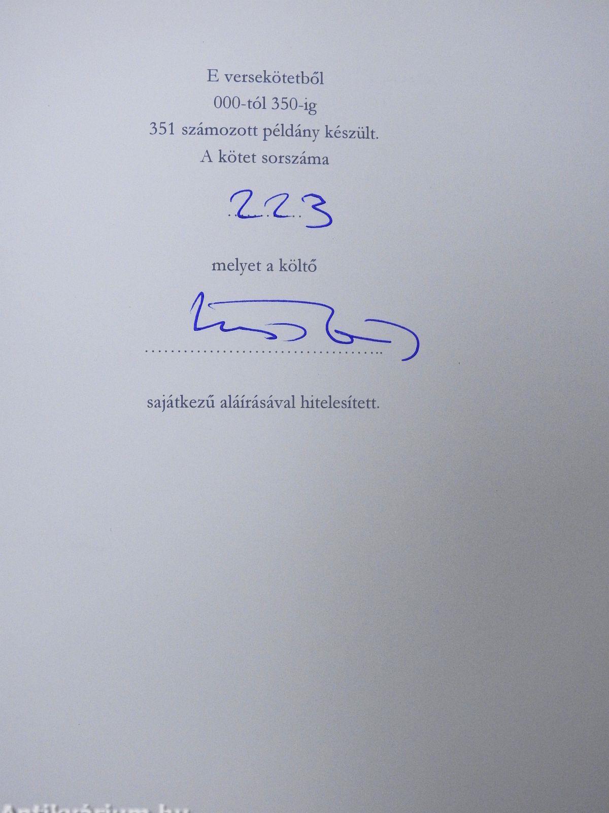 A címlapon a szerző, Kiss Dénes névre szóló dedikációja valamint az egyik lapon az aláírása látható. Ez a 223 számú példány.