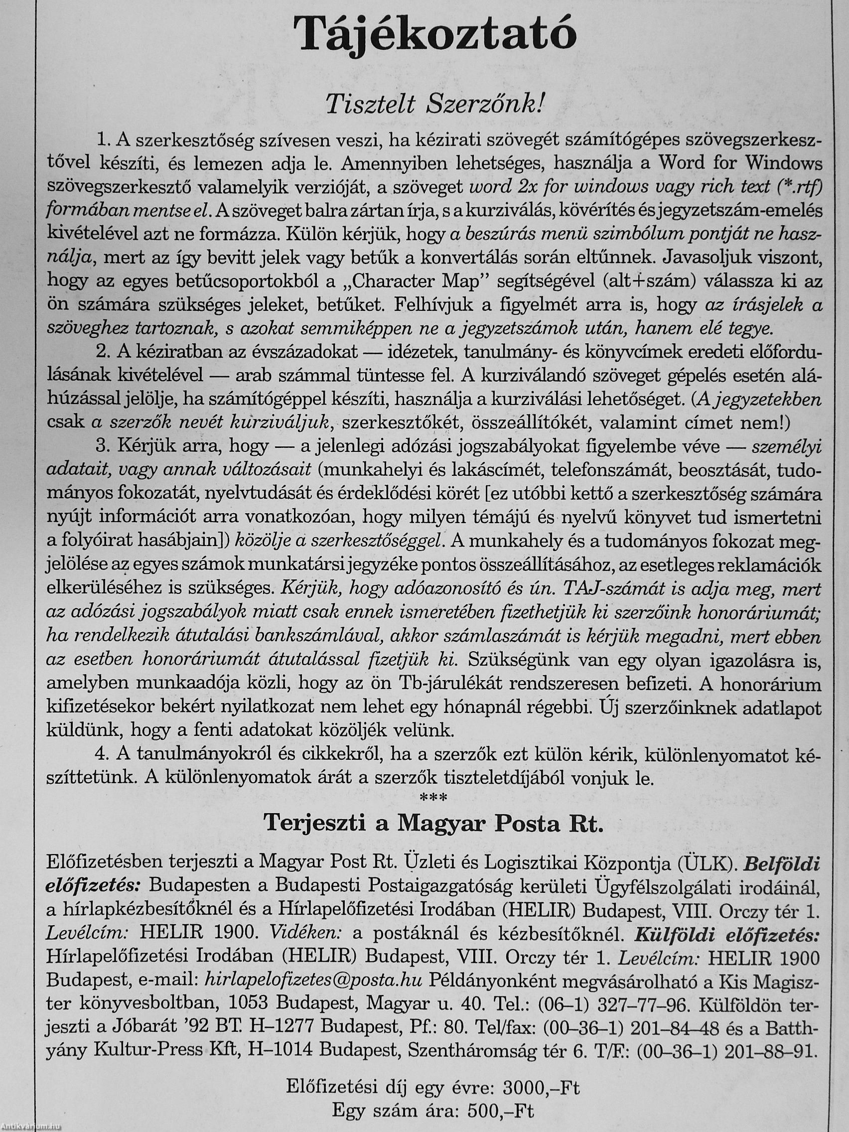 3. Kéljük arra, hogy — a jelenlegi adózási jogszabályokat figyelembe véve — személyi adatait, vagy annak változásait (munkahelyi és lakáscímét, telefonszámát, beosztását, tudományos fokozatát, nyelvtudását és érdeklődési körét [ez utóbbi kettő a szerkesztőség számára n3mjt információt arra vonatkozóan, hogy milyen témájú és nyelvű könyvet tud ismertetni a folyóirat hasábjain]) közölje a szerkesztőséggel. A munkahely és a tudományos fokozat megjelölése az egyes számok munkatársi jegyzéke pontos összeállításához, az esetleges reklamációk elkerüléséhez is szükséges. Kérjük, hogy adóazonosító és ún. TAJ-számát is adja meg, mert az adózási jogszabályok miatt csak ennek ismeretében fizethetjük ki szerzőink honoráriumát; ha rendelkezik átutalási bankszámlával, akkor számlaszámát is kérjük megadni, mert ebben az esetben honoráriumát átutalással fizetjük ki. Szükségünk van egy olyan igazolásra is, amelyben munkaadója közli, hogy az ön Tb-járulékát rendszeresen befizeti. A honorárium kifizetésekor bekért nyilatkozat nem lehet egy hónapnál régebbi. Új szerzőinknek adatlapot küldünk, hogy a fenti adatokat közöljék velünk.
