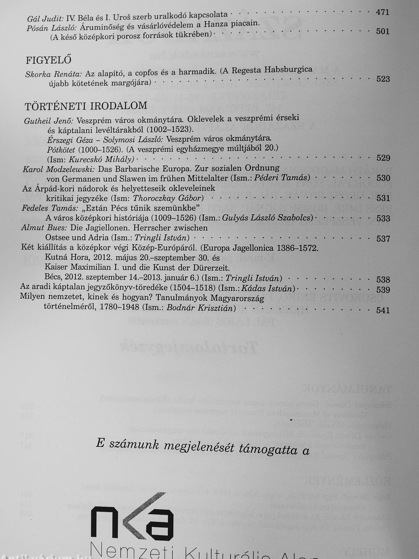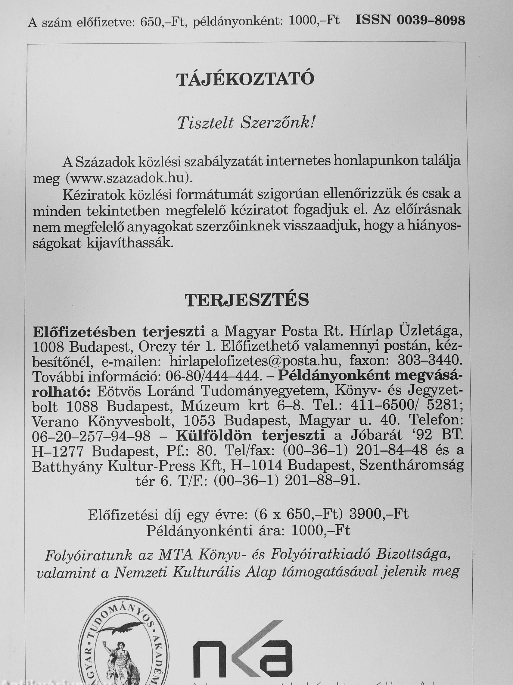 | Sorozatcím: | Századok |