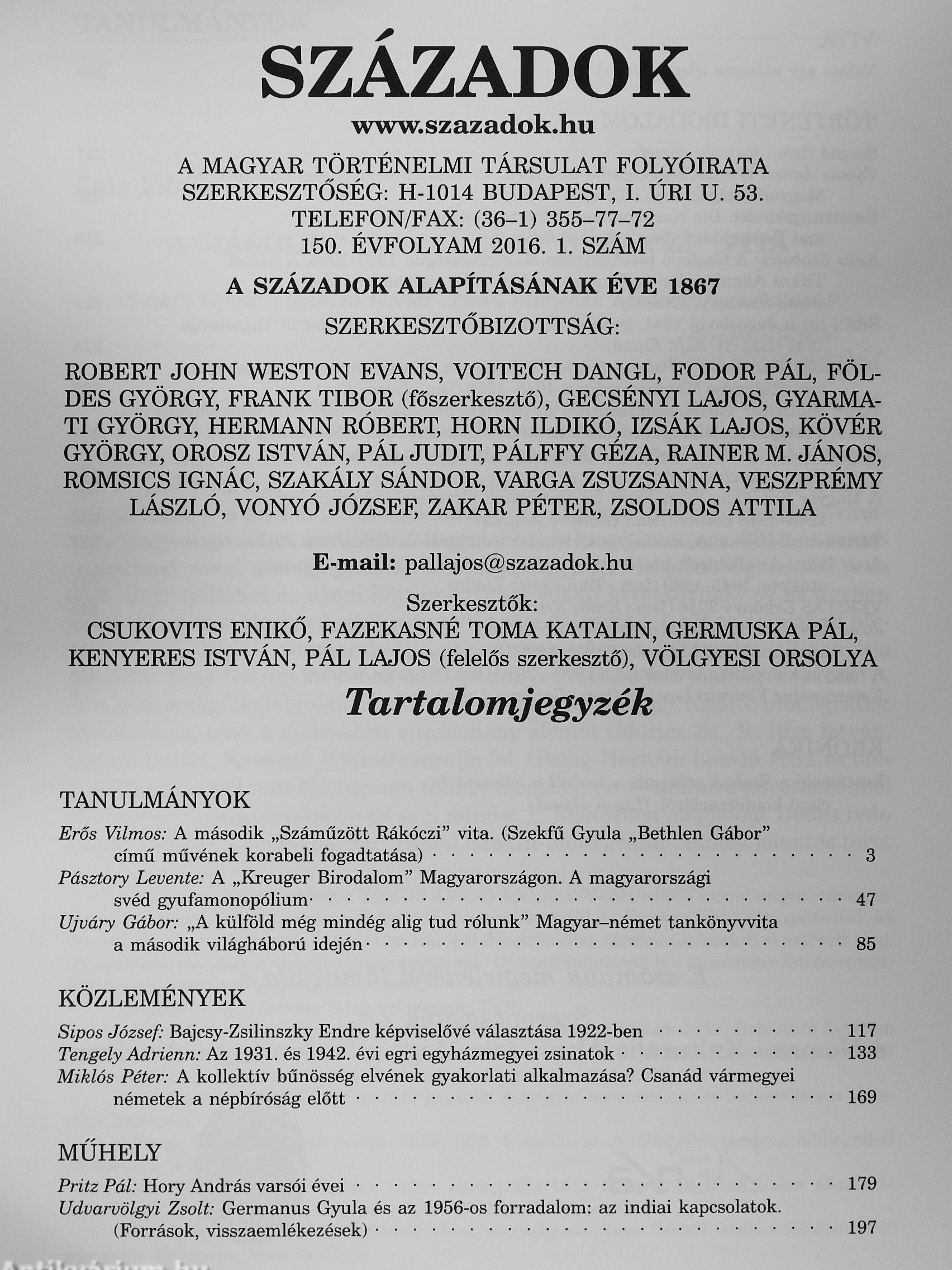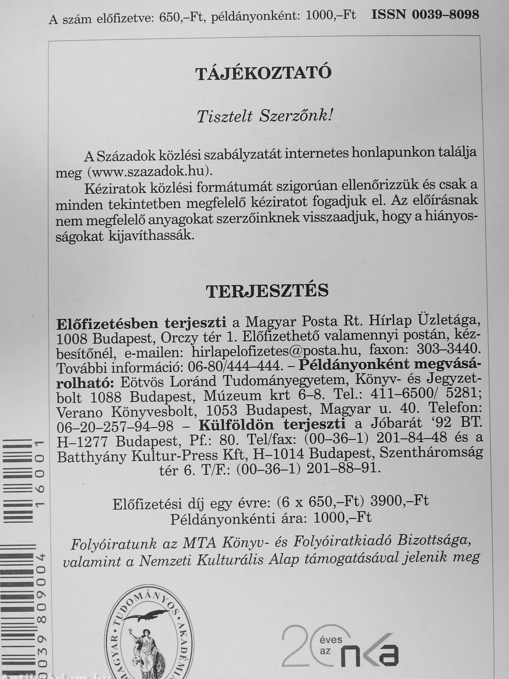 | Sorozatcím: | Századok |