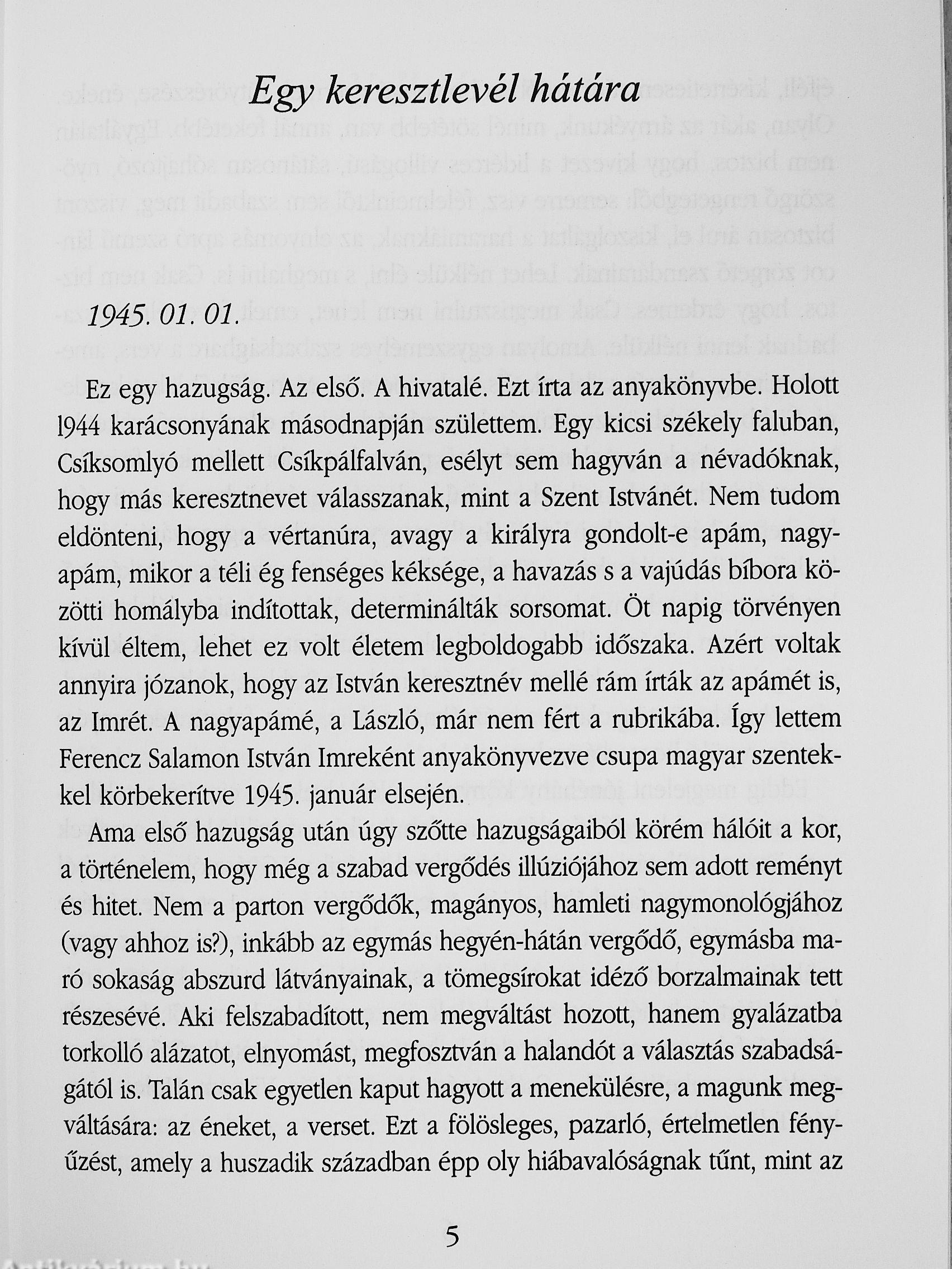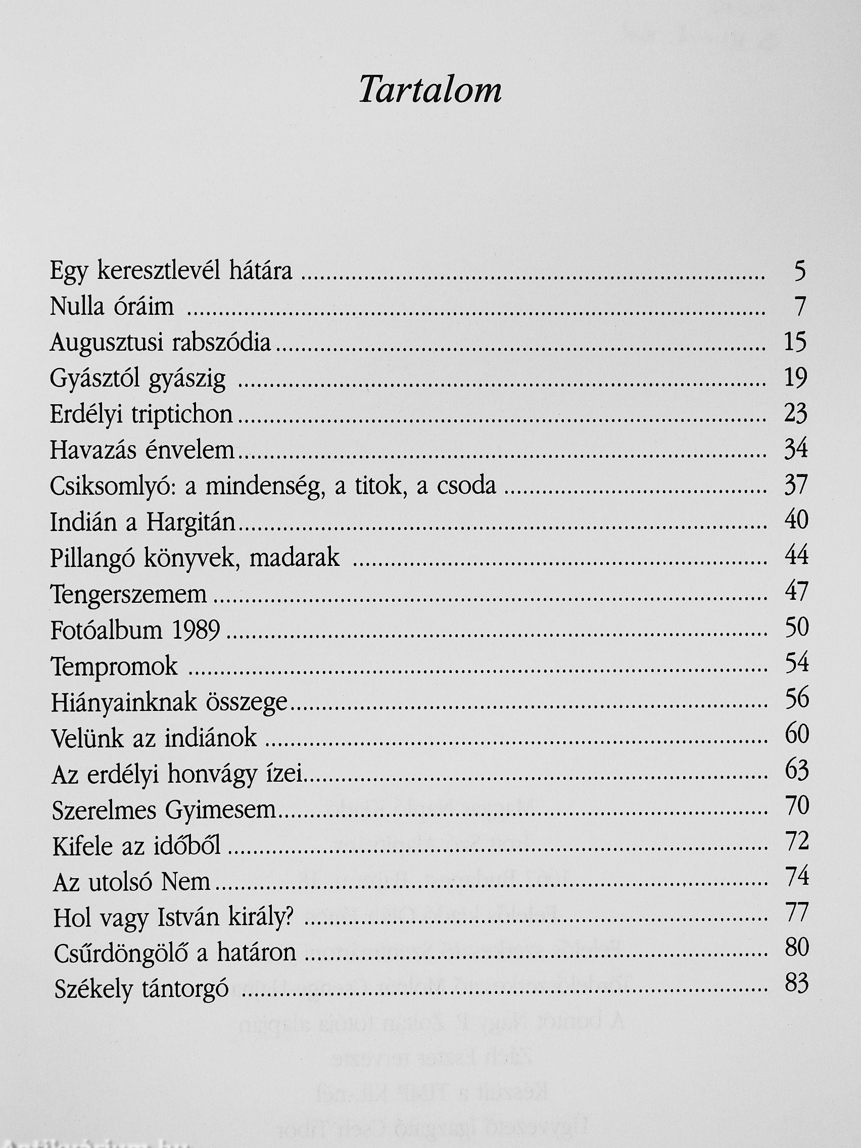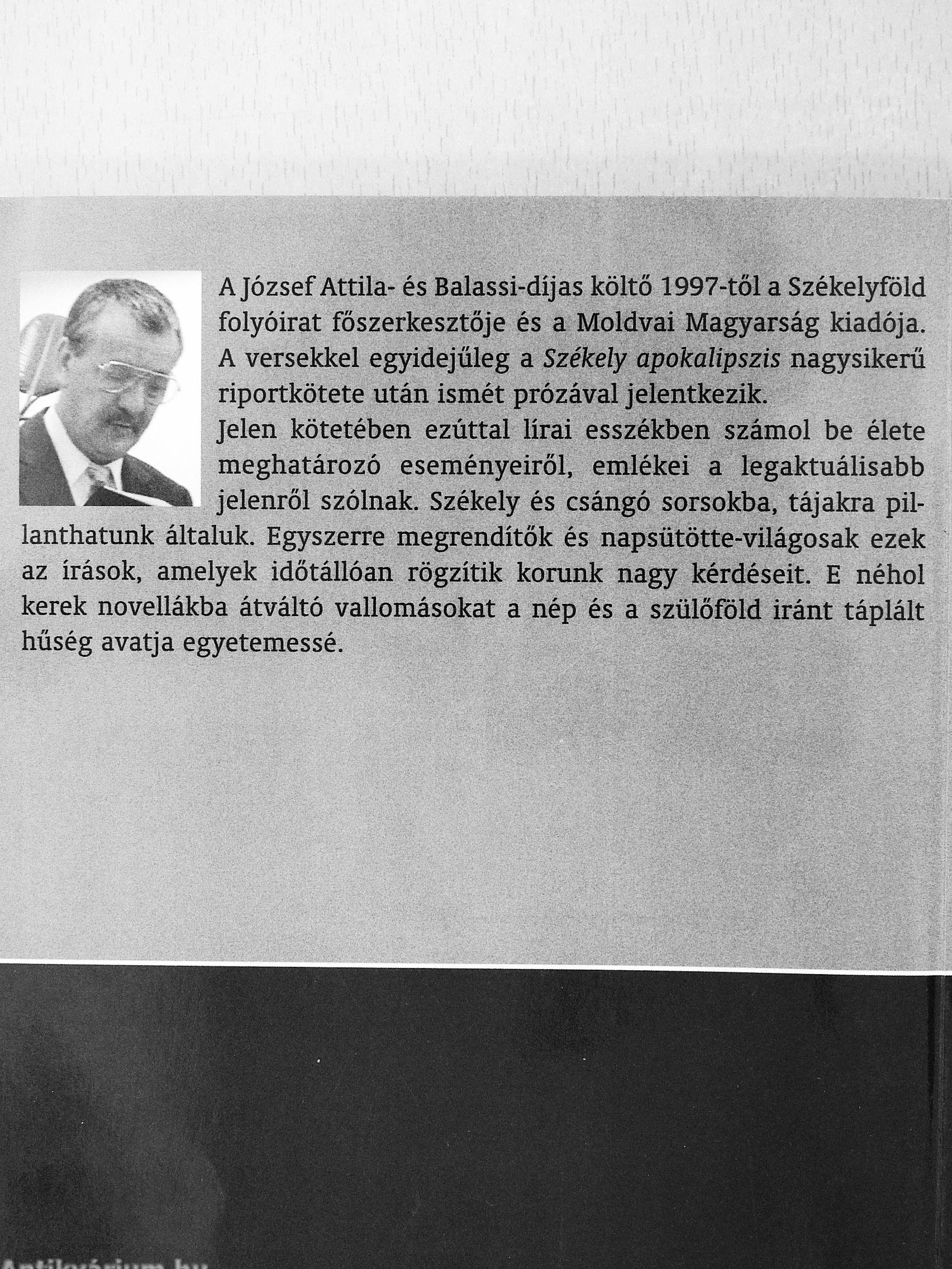 A József Attila- és Balassi-díjas költő 1997-töl a Székelyföld folyóirat főszerkesztője és a Moldvai Magyarság kiadója. A versekkel egyidejűleg a Székely apokalipszis nagysikerű riportkötete után ismét prózával jelentkezik. Jelen kötetében ezúttal lírai esszékben számol be élete meghatározó eseményeiről, emlékei a legaktuálisabb jelenről szólnak. Székely és csángó sorsokba, tájakra pillanthatunk általuk. Egyszerre megrendítők és napsütötte-világosak ezek az írások, amelyek időtállóan rögzítik korunk nagy kérdéseit. E néhol kerek novellákba átváltó vallomásokat a nép és a szülőföld iránt táplált hűség avatja egyetemessé.