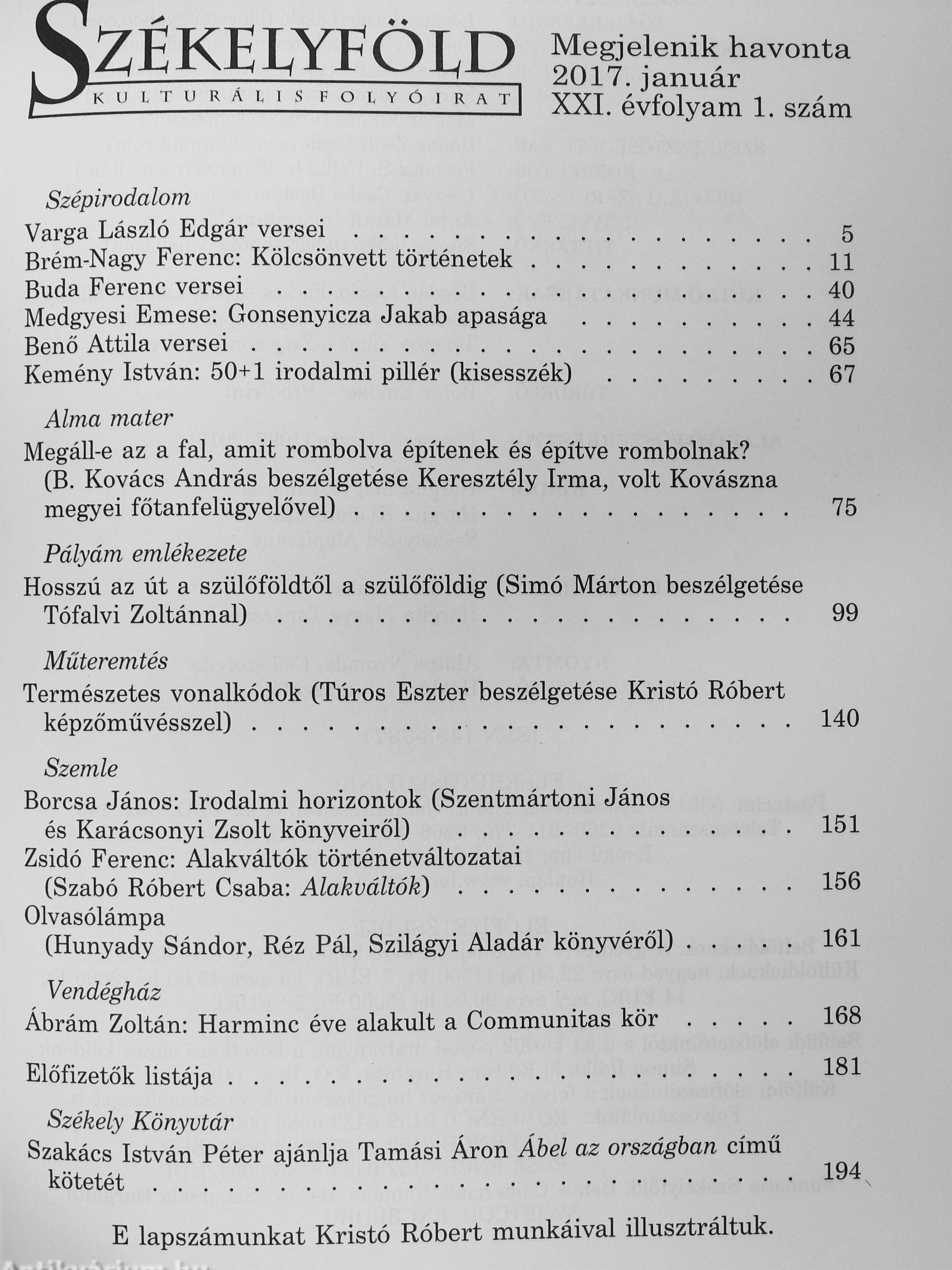 - költő, író, Tiszakécske Kemény István (Budapest, 1961) - költő, író, Budapest l ¦ Kristó Róbert (Csíkszereda, ^' 1974) - grafikus, Csíkszereda r' B. Kovács András (Kolozsvár, í 1949) - újságíró, közíró, i Sepsiszentgyörgy í Medgyesi Emese (Marosvásár- [ hely, 1961) - író, Brüsszel K Simó Márton (Urikány, 1963) [