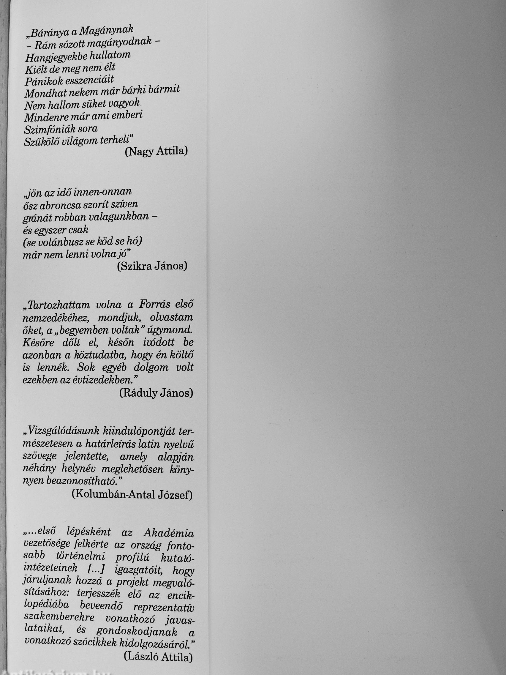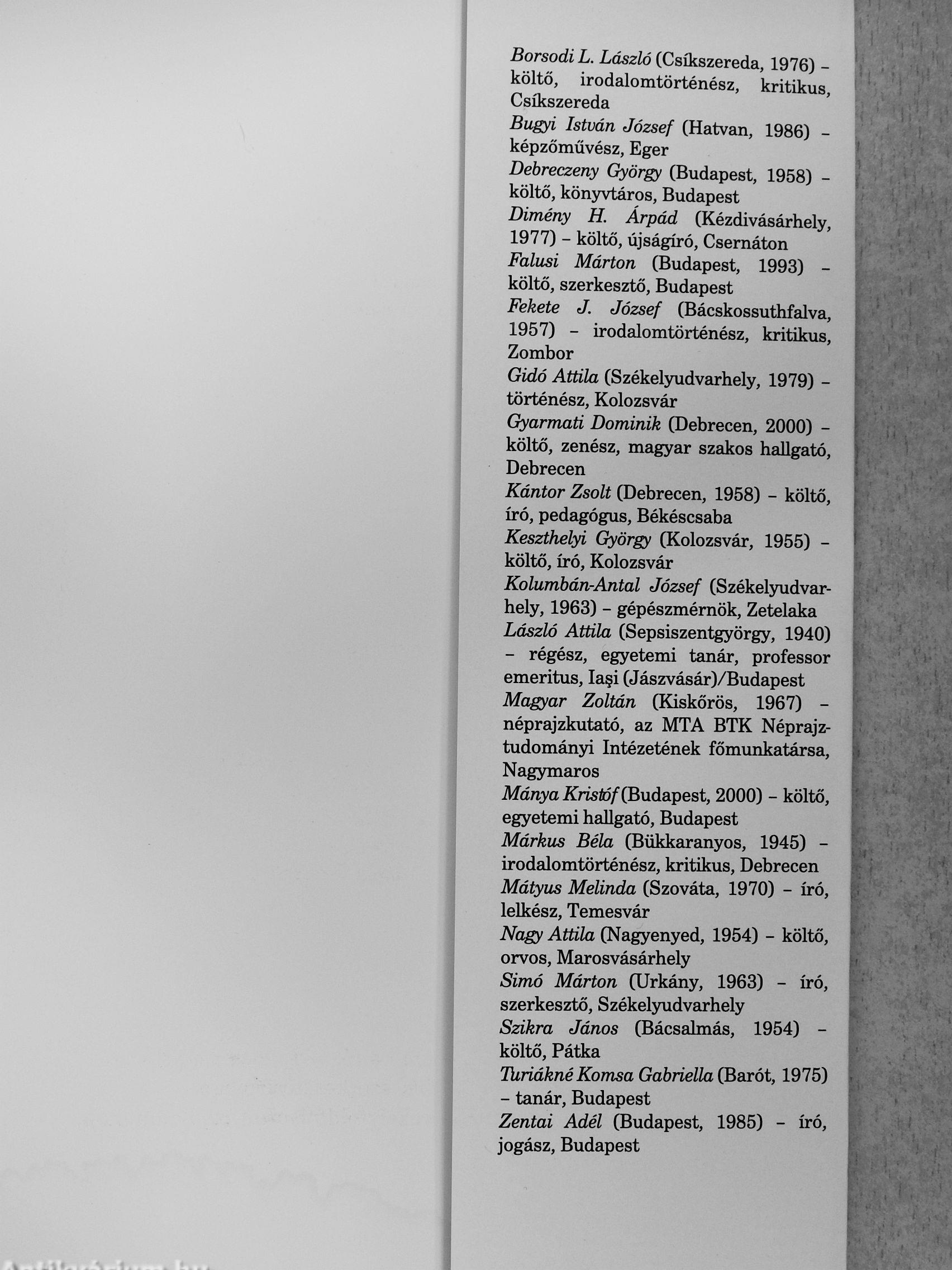 Mónyo íTnsiö/CBudapest, 2000) - költő, egyetemi hallgató, Budapest Márkus Béla (Bükkaranyos, 1945) -irodalomtörténész, kritikus, Debrecen Mátyus Melinda (Szováta, 1970) - író, lelkész, Temesvár