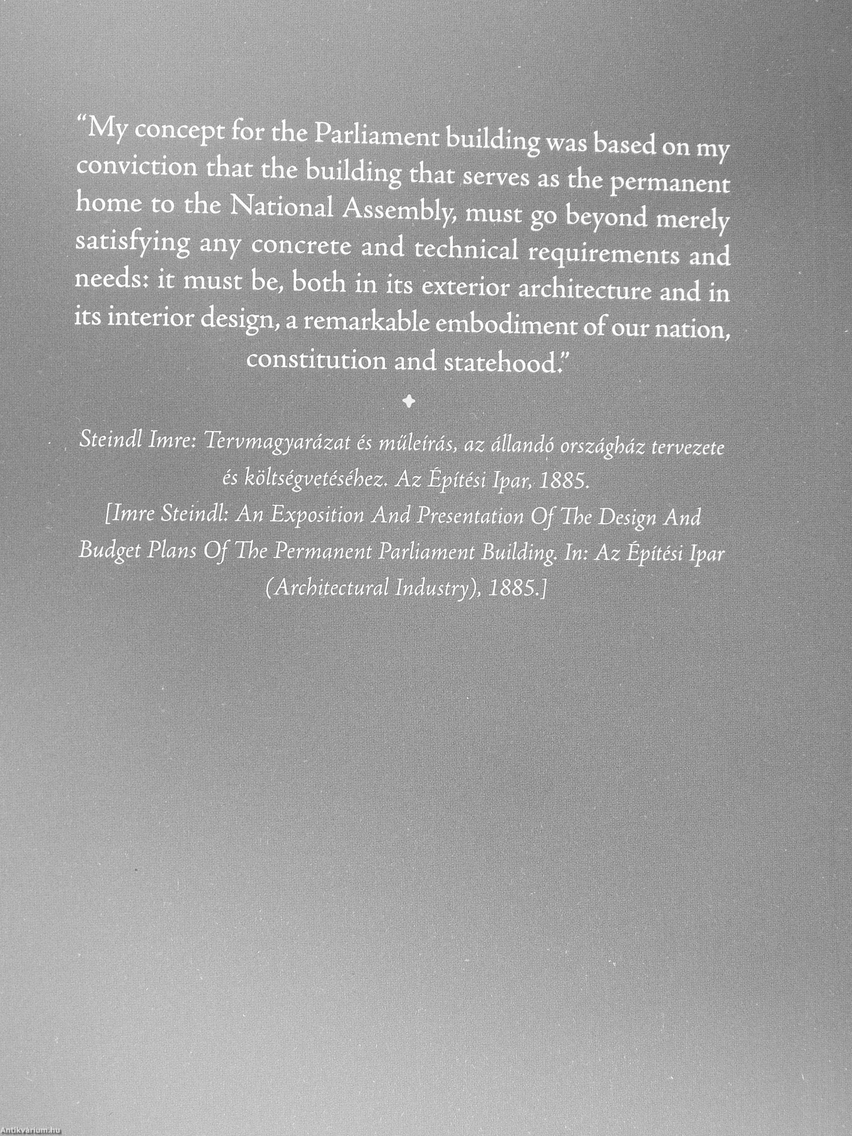 Visitors - Hungarians, foreigners, guests alike - enter this building with a common and ageless awe on their faces and in their hearts even those who work here and see the beautiful hallways, chambers and rooms day after day find sources of profound amazement. A door handle a minute motif on the wall the myriad of fantastic creatures on the ceiling frescos, each one different than the others all keep talking about our past, our present and sometimes even about our future.