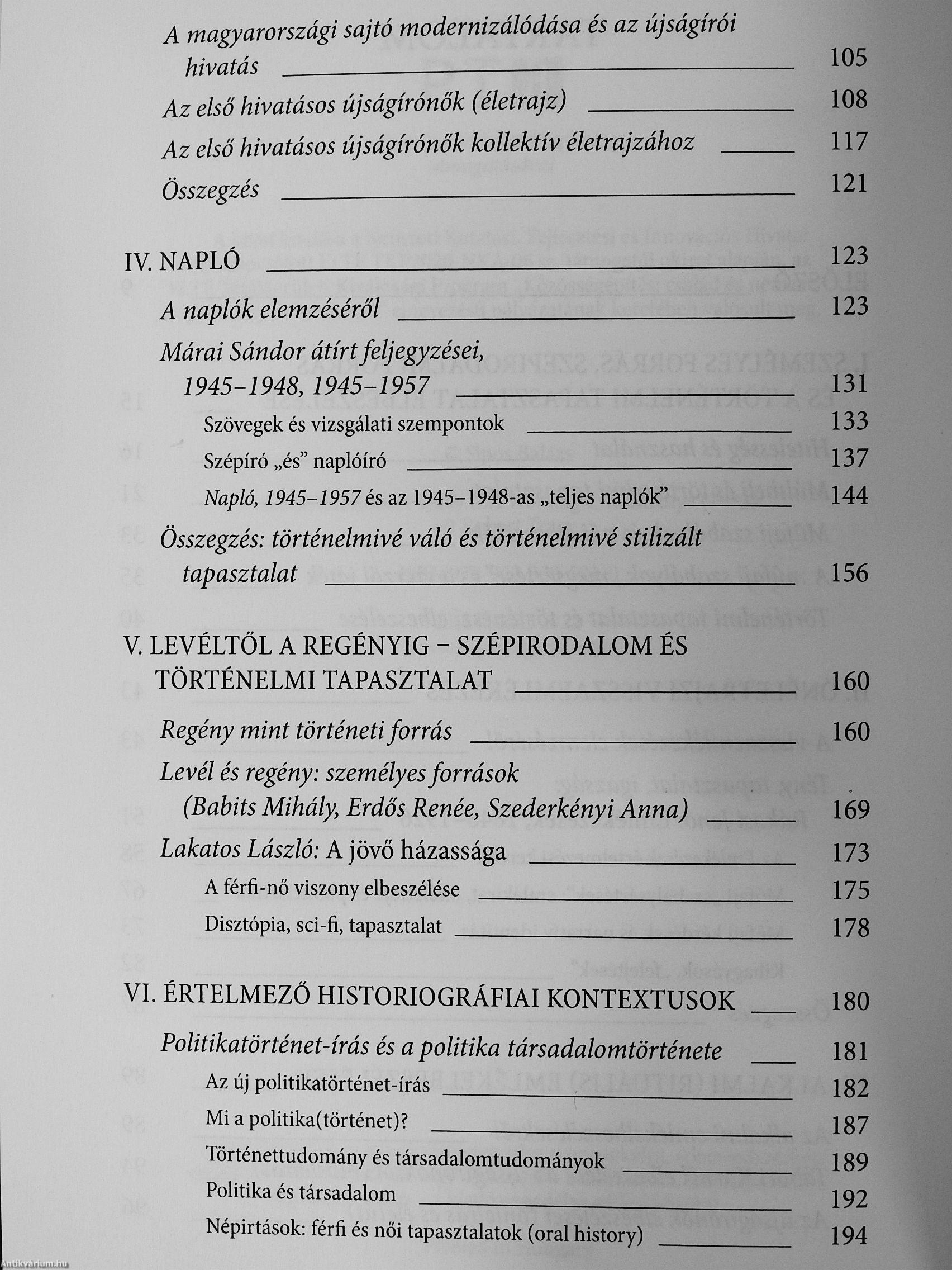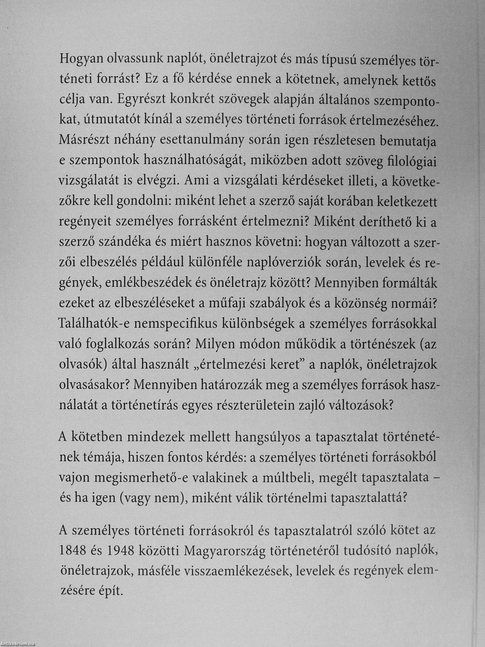 A személyes történeti forrásokról és tapasztalatról szóló kötet az 1848 és 1948 közötti Magyarország történetéről tudósító naplók, önéletrajzok, másféle visszaemlékezések, levelek és regények elemzésére épít.