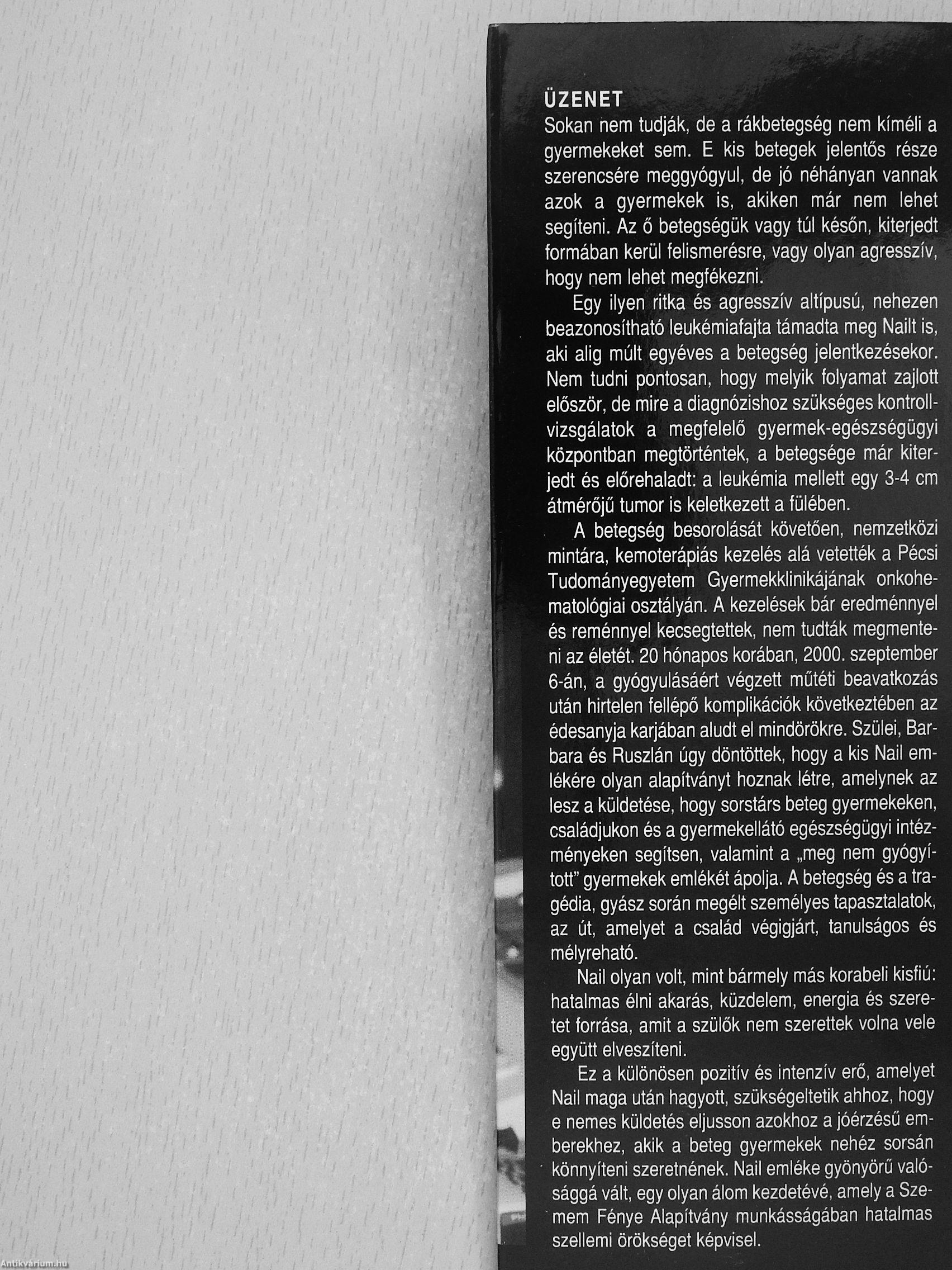 A betegség besorolását követően, nemzetközi mintára, kemoterápiás kezelés alá vetették a Pécsi Tudományegyetem Gyermekklinikájának onkohe-matológiai osztályán. A kezelések bár eredménnyel és reménnyel kecsegtettek, nem tudták megmenteni az életét. 20 hónapos korában, 2000. szeptember 6-án, a gyógyulásáért végzett műtéti beavatkozás után hirtelen fellépő komplikációk következtében az édesanyja karjában aludt el mindörökre. Szülei, Barbara és Ruszlán úgy döntöttek, hogy a kis Nail emlékére olyan alapítványt hoznak létre, amelynek az lesz a küldetése, hogy sorstárs beteg gyermekeken, családjukon és a gyermekellátó egészségügyi intézményeken segítsen, valamint a „meg nem gyógyított" gyermekek emlékét ápolja. A betegség és a tragédia, gyász során megélt személyes tapasztalatok, az út, amelyet a család végigjárt, tanulságos és mélyreható.
