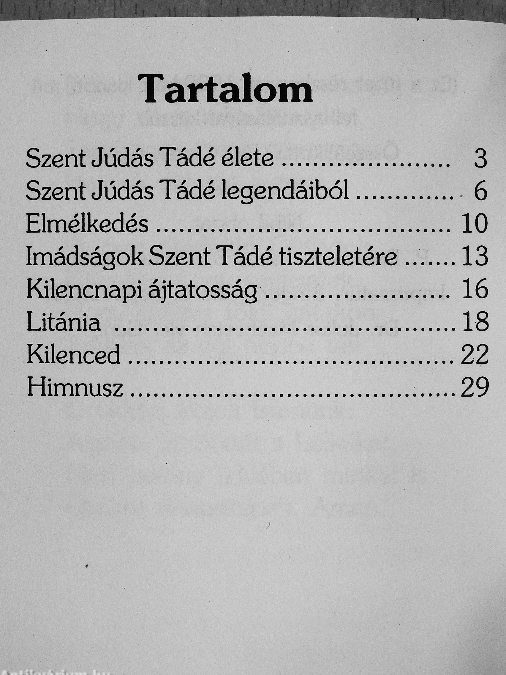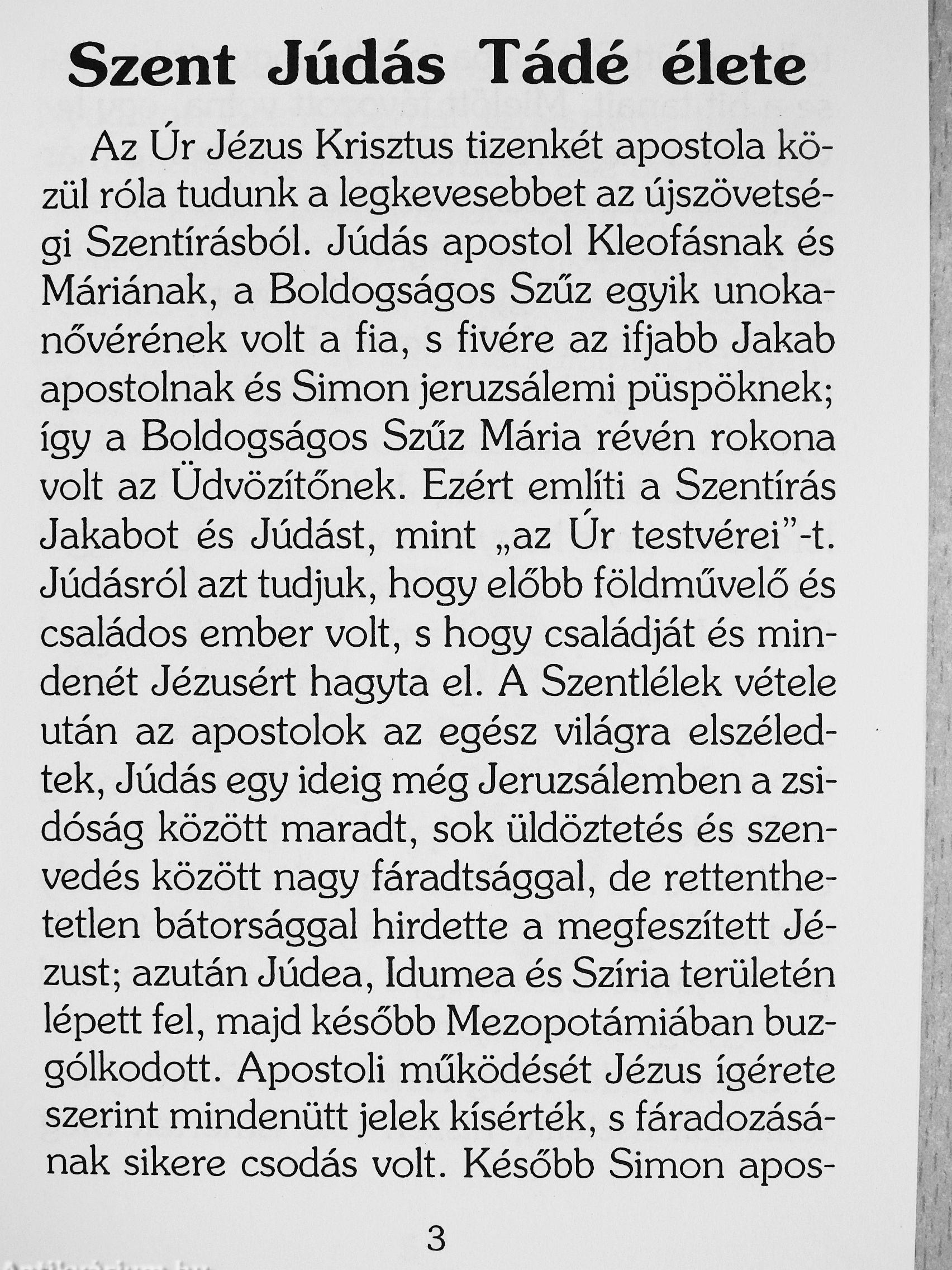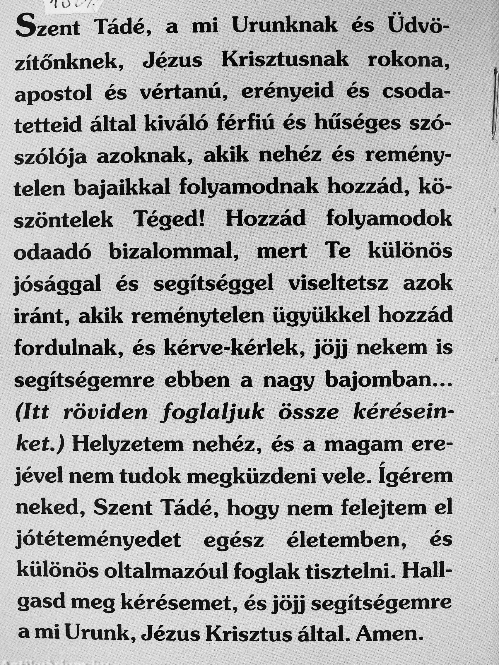 Szent Tádé, a ml Urunknak és Üdvözítőnknek, Jézus Krisztusnak rokona, apostol és vértanú, erényeid és csodatetteid által kiváló férfiú és hűséges szószólója azoknak, akik nehéz és reménytelen bajaikkal folyamodnak hozzád, köszöntelek Téged! Hozzád folyamodok odaadó bizalommal, mert Te különös jósággal és segítséggel viseltetsz azok iránt, akik reménytelen ügyükkel hozzád fordulnak, és kérve-kérlek, jöjj nekem is segítségemre ebben a nagy bajomban (Itt röviden foglaljuk össze kéréseinket.) Helyzetem nehéz, és a magam erejével nem tudok megküzdeni vele. ígérem neked. Szent Tádé, hogy nem felejtem el jótéteményedet egész életemben, és különös oltalmazóul foglak tisztelni. Hallgasd meg kérésemet, és jöjj segítségemre a mi Urunk, Jézus Krisztus által. Amen.