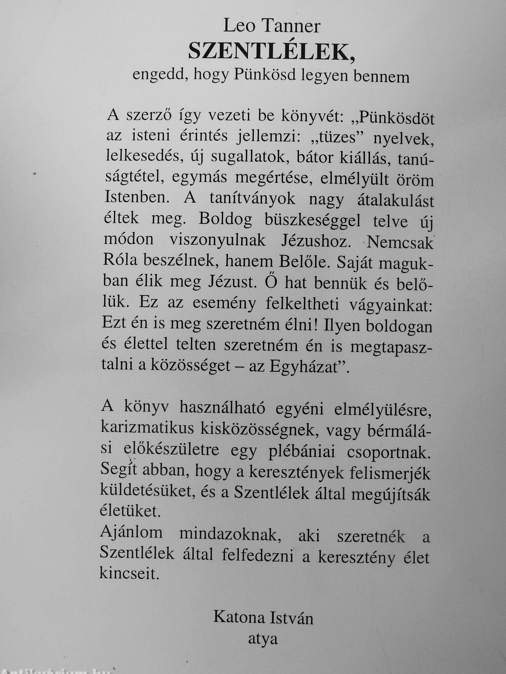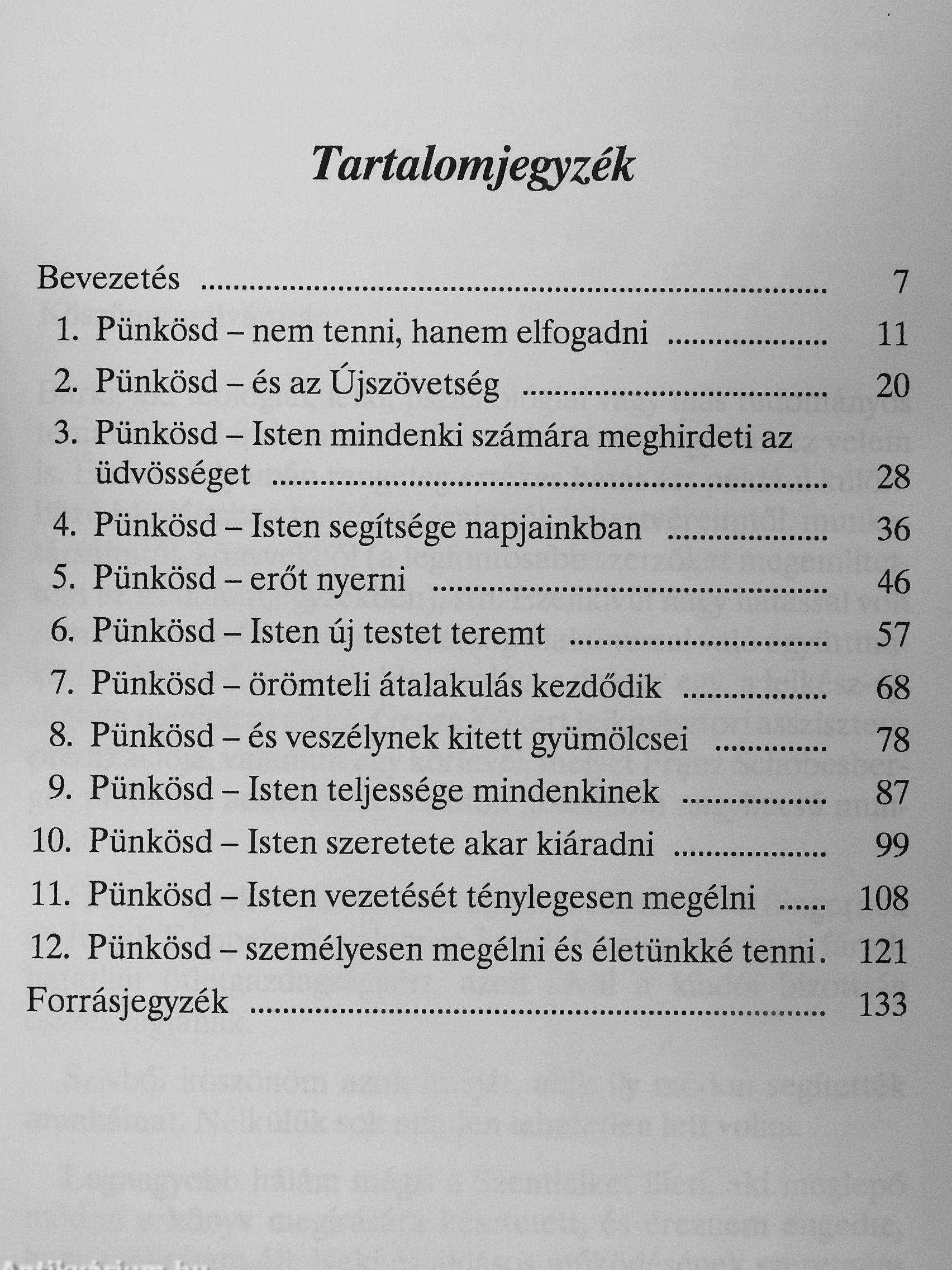 A szerző így vezeti be könyvét: „Pünkösdöt az isteni érintés jellemzi: „tüzes" nyelvek, lelkesedés, új sugallatok, bátor kiállás, tanúságtétel, egymás megértése, elmélyült öröm Istenben. A tanítványok nagy átalakulást éltek meg. Boldog büszkeséggel telve új módon viszonyulnak Jézushoz. Nemcsak Róla beszélnek, hanem Belőle. Saját magukban élik meg Jézust. Ö hat bennük és belőlük. Ez az esemény felkeltheti vágyainkat: Ezt én is meg szeretném élni! Ilyen boldogan és élettel telten szeretném én is megtapasztalni a közösséget - az Egyházat".