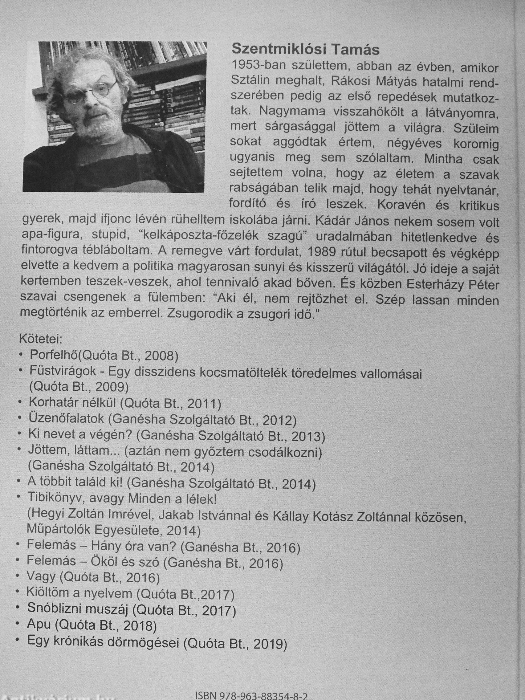 Szentmiklósi Tamás 1953-ban születtem, abban az évben, amikor Sztálin meghalt, Rákosi Mátyás hatalmi rendszerében pedig az első repedések mutatkoztak. Nagymama visszahőkölt a látványomra, mert sárgasággal jöttem a világra. Szüleim sokat aggódtak értem, négyéves koromig ugyanis meg sem szólaltam. Mintha csak sejtettem volna, hogy az életem a szavak rabságában telik majd, hogy tehát nyelvtanár, fordító és író leszek. Koravén és kritikus gyerek, majd ifjonc lévén rühelltem iskolába járni. Kádár János nekem sosem volt apa-figura, stupid, "kelkáposzta-főzelék szagú" uradalmában hitetlenkedve és fintorogva tébláboltam. A remegve várt fordulat, 1989 rútul becsapott és végképp elvette a kedvem a politika magyarosan sunyi és kisszerű világától. Jó ideje a saját kertemben teszek-veszek, ahol tennivaló akad bőven. És közben Esterházy Péter szavai csengenek a fülemben: "Aki él, nem rejtőzhet el. Szép lassan minden megtörténik az emberrel. Zsugorodik a zsugori idő."