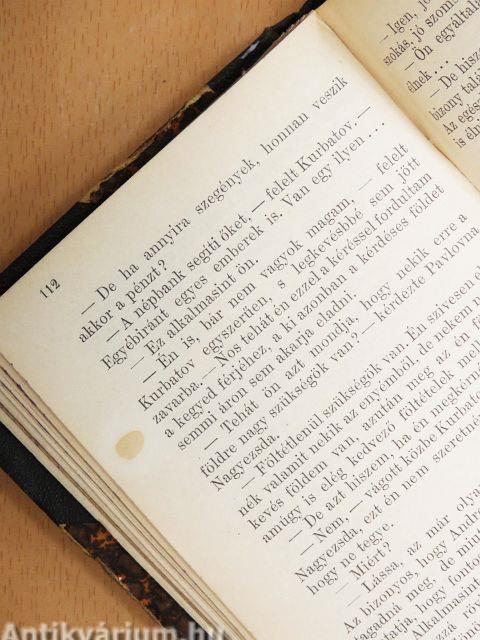 Lombos, vén fűzfákkal szegélyezett, széles tó közepén, a melyek mögül varjúfészkekkel megrakott karcsu nyárfák kandikáltak elő, széle és lapos fenekű szép fehér ladik siklott tova. Az orrához közelebb álló két kereszt-padkán ültek és erőlködve feküdtek neki az evezőknek Naszturcziev és Sztrizsnyev; az első a végén fölfelé kunkorodó kis, sötét bajusszal és alig pelyhedző fekete szakállal, a másik pedig teljesen beretválva, a minek következtében kis arczának semmit mondó vonásai szinte gyerekes jelleget öltöttek. Vissza