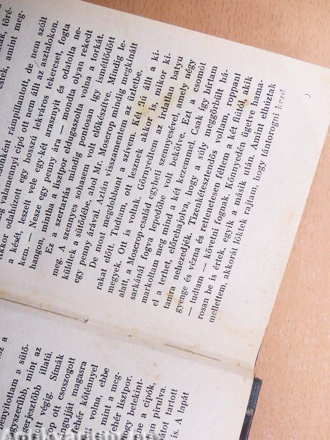 Moscropék üzlete a sarkon állott. A homlokzat a főutcára nyílt. A sütőházhoz a bejárat hátul volt, a mellékutcában. Aznap este ugyancsak csábító volt a kirakat, különösen mert az utcákat gomolygó sárga köd ülte meg. Mindössze néhány nap választott el karácsonytól. Részben hosszúkás, harmonikaszerű, részben gömbalakú lampionokban gyertyák égtek, fokozva a kirakatot általában világító két gázláng fényét. A kirakat hosszában hosszú sárgarézcső futott végig, amelyből csecsbimbószerűen bukkant ki vagy féltucat gázégő, de ezek közül soha nem égett, csak a szélső kettő. Azt hiszem, mint mindnyájunknak Hulmeben, Moscropéknak is jól meg kellett nézniök a pénzt.