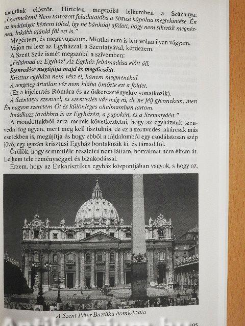 Kell-e, szabad-e, lehet-e előszót írni misztikus tartalmú irodalomhoz? Hozzátehet-e még valamit az ember ahhoz, amit egy lélek belső szentélyében közvetlenül Istentől és a Szűzanyától kap? Én szívem szerint a fenti kérdésekre nemleges választ adnék. Hogy a bevezetés mégis megszületett, annak elsődleges oka a szerzőhöz fűződő komoly barátságom. Kérésére nem mondhattam nemet. Nem hiszek a véletlenekben. Máriát, a könyv szerzőjét „véletlenül" ismertem meg. Tinédzser fia az általam vezetett regnumi (Regnum Marianum rk. lelkiségi mozgalom) kiscsoportba került 1984-ben. Az első családlátogatástól kezdve mély szimpátiát éreztem édesanyja, és egész családja iránt, amely azután később barátsággá fejlődött. Annak ellenére, hogy nagyon különböző emberek vagyunk, és elfoglaltságunk miatt igen ritkán találkozunk, Mária lelkileg közelebb áll hozzám, mint sok más barátom. A Gondviselés pedig időről-időre bizonyos csomópontokban „összehozza" életünket. Ilyen ez a könyv is. Az előszó írásakor egyik első gondolatom az volt, hogyan fogalmazzam meg mindazt, amik miatt kezdettől fogva hitelesnek tartottam Mária misztikus élményeit. (Anélkül persze, hogy az Egyház helyett magamnak vindikálnám a „nihil obstat" minősítés jogát.) „Vizsgáljatok meg mindent!" (1 Tessz. 5,21) mondja a Szentírás. Én, aki racionálisan gondolkodom, alaposan, többször is végig olvastam a könyvet, és úgy látom, a szerző megtapasztalásai valóban Istentől és a Szűzanyától valók: - Mindenek előtt azért, mert nincs ellentétben a Szentírással. Nem mond sem mást, sem többet, mint a kinyilatkoztatás. - Másodszor: .Ismerve a szerzőt kijelenthetem, Mária nem „elvarázsolt" ember. Ellenkezőleg, két lábbal a földön járó „hétköznapi" keresztény. Római katolikus hitét természetes életszerűséggel éli meg (a gyakorlati szeretet cselekedetei által is) a családjában, környezetében. - Végezetül: sem a lelkiségi mozgalmát (Fokoláre) melyhez tartozik, sem az engesztelő életformát nem akarja senkire ráerőltetni. Rábízza az olvasóra, hogy Isten hívását követve, mindenki szabadon találja meg saját útját. Mária életének komoly, központi része az engesztelés. Ahhoz, hogy az engesztelő életformát - mint az Isten szolgálatának, és a szeretet megélésének egyik lehetséges útját - jól megértse minden olvasó, fontos tudni a következőket: Az engesztelés gondolata benne van a kinyilatkoztatásban, tehát mindig időszerű. Vissza