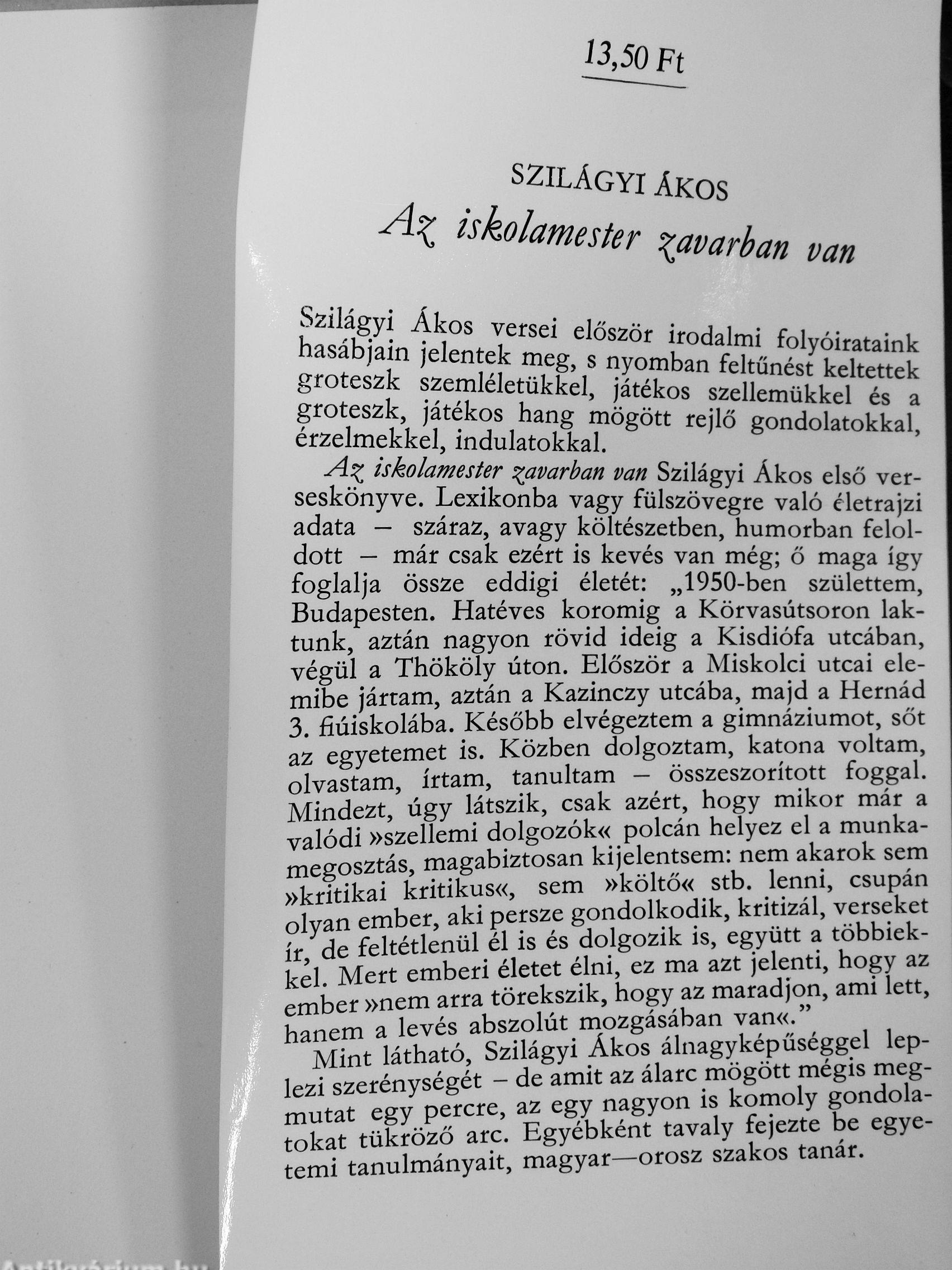 ^^ iskolamester i^avarban van Szilágyi Ákos első verseskönyve. Lexikonba vagy fülszövegre való életrajzi adata - száraz, avagy költészetben, humorban feloldott - már csak ezért is kevés van még; ő maga így foglalja össze eddigi életét: „1950-ben születtem, Budapesten. Hatéves koromig a Körvasútsoron laktunk, aztán nagyon rövid ideig a Kisdiófa utcában, végül a Thököly úton. Először a Miskolci utcai elemibe jártam, aztán a Kazinczy utcába, majd a Hernád 3. fiúiskolába. Később elvégeztem a gimnáziumot, sőt az egyetemet is. Közben dolgoztam, katona voltam, olvastam, írtam, tanultam - összeszorított foggal. Mindezt, úgy látszik, csak azért, hogy mikor már a valódi »szellemi dolgozók« polcán helyez el a munkamegosztás, magabiztosan kijelentsem: nem akarok sem »kritikai kritikus«, sem »költő« stb. lenni, csupán olyan ember, aki persze gondolkodik, kritizál, verseket ír, de feltétlenül él is és dolgozik is, együtt a többiekkel. Mert emberi életet élni, ez ma azt jelenti, hogy az ember »nem arra törekszik, hogy az maradjon, ami lett, hanem a levés abszolút mozgásában van«."