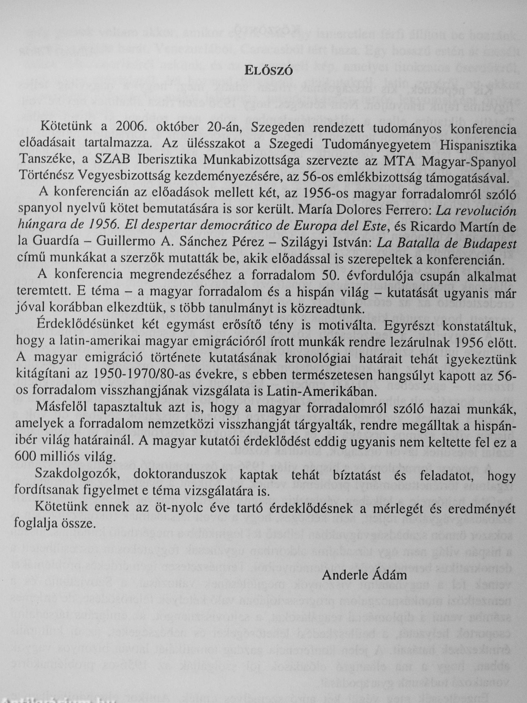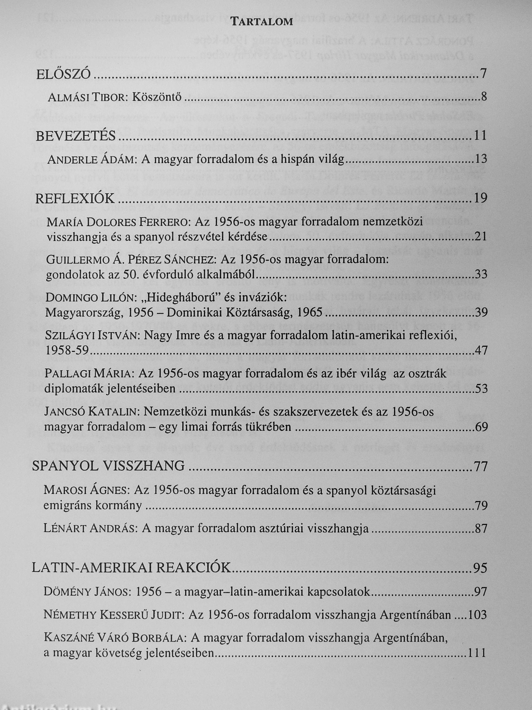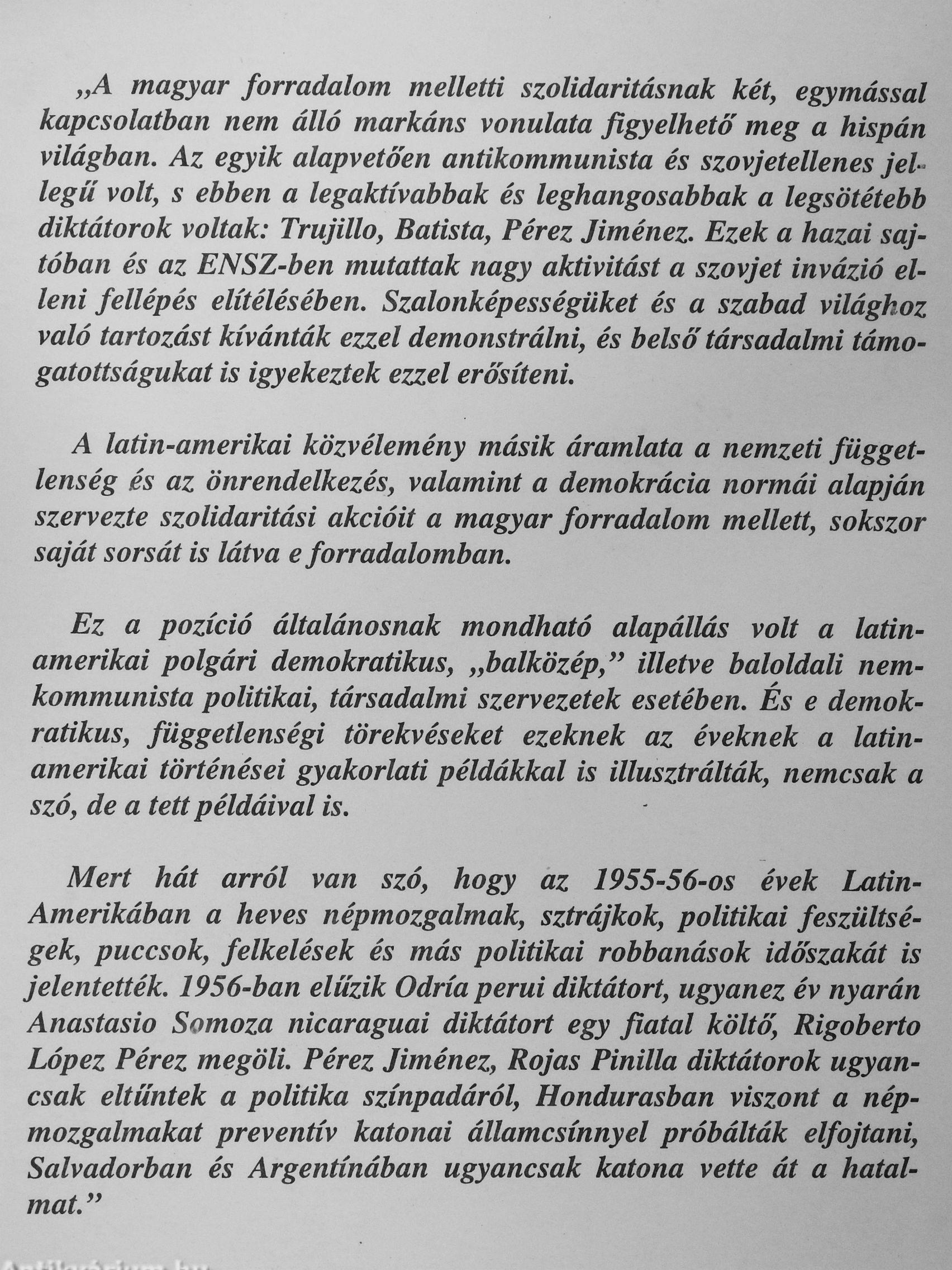 „A magyar forradalom melletti szolidaritásnak két, egymással kapcsolatban nem álló markáns vonulata figyelhető meg a hispán világban. Az egyik alapvetően antikommunista és szovjetellenes jellegű volt, s ebben a legaktívabbak és leghangosabbak a legsötétebb diktátorok voltak: Trujillo, Batista, Pérez Jiménez. Ezek a hazai sajtóban és az ENSZ-ben mutattak nagy aktivitást a szovjet invázió elleni fellépés elítélésében. Szalonképességüket és a szabad világhoz való tartozást kívánták ezzel demonstrálni, és belső társadalmi támogatottságukat is igyekeztek ezzel erősíteni.