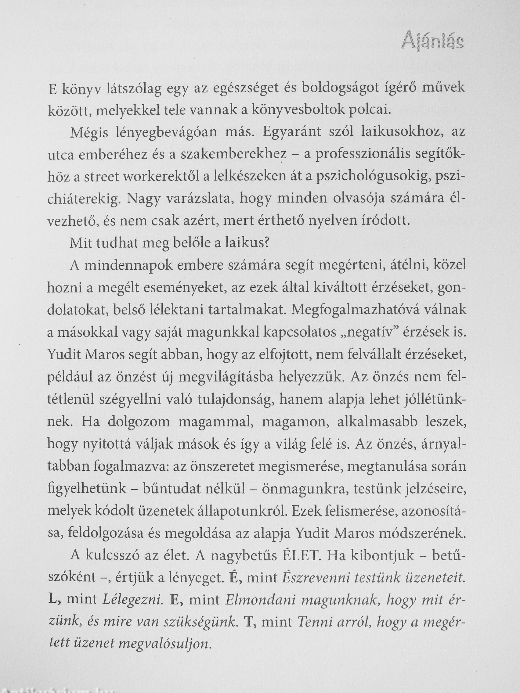 Ritka az ilyen érthető, világos és egyben olvasmányos könyv az önsegítő irodalomban. De ne tévesszen meg senkit a stílus közvetlensége; ez a mű az érzelmi egészség korszerű és átfogó útmutatója. Több mint két évtizedes klinikai tapasztalattal és egy tudós fegyelmezett gondolkodásával Yudit Maros a modern pszichoterápia javát kristályosítja a 21. század önsegítő eszközévé.