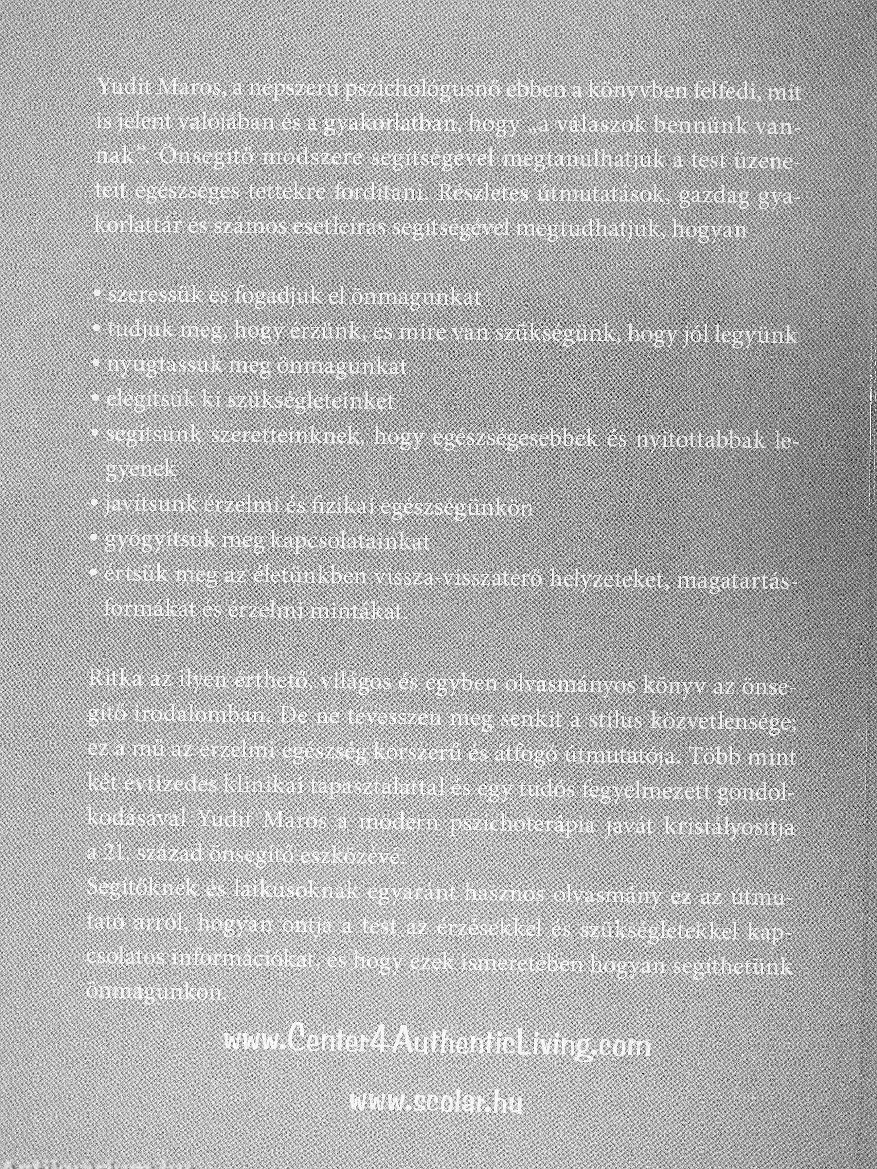 Yudit Maros, a népszerű pszichológusnő ebben a könyvben felfedi, mit is jelent valójában és a gyakoriatban, hogy „a válaszok bennünk vannak". Önsegítő módszere segítségével megtanulhatjuk a test üzeneteit egészséges tettekre fordítani. Részletes útmutatások, gazdag gyakorlattár és számos esetleírás segítségével megtudhatjuk, hogyan