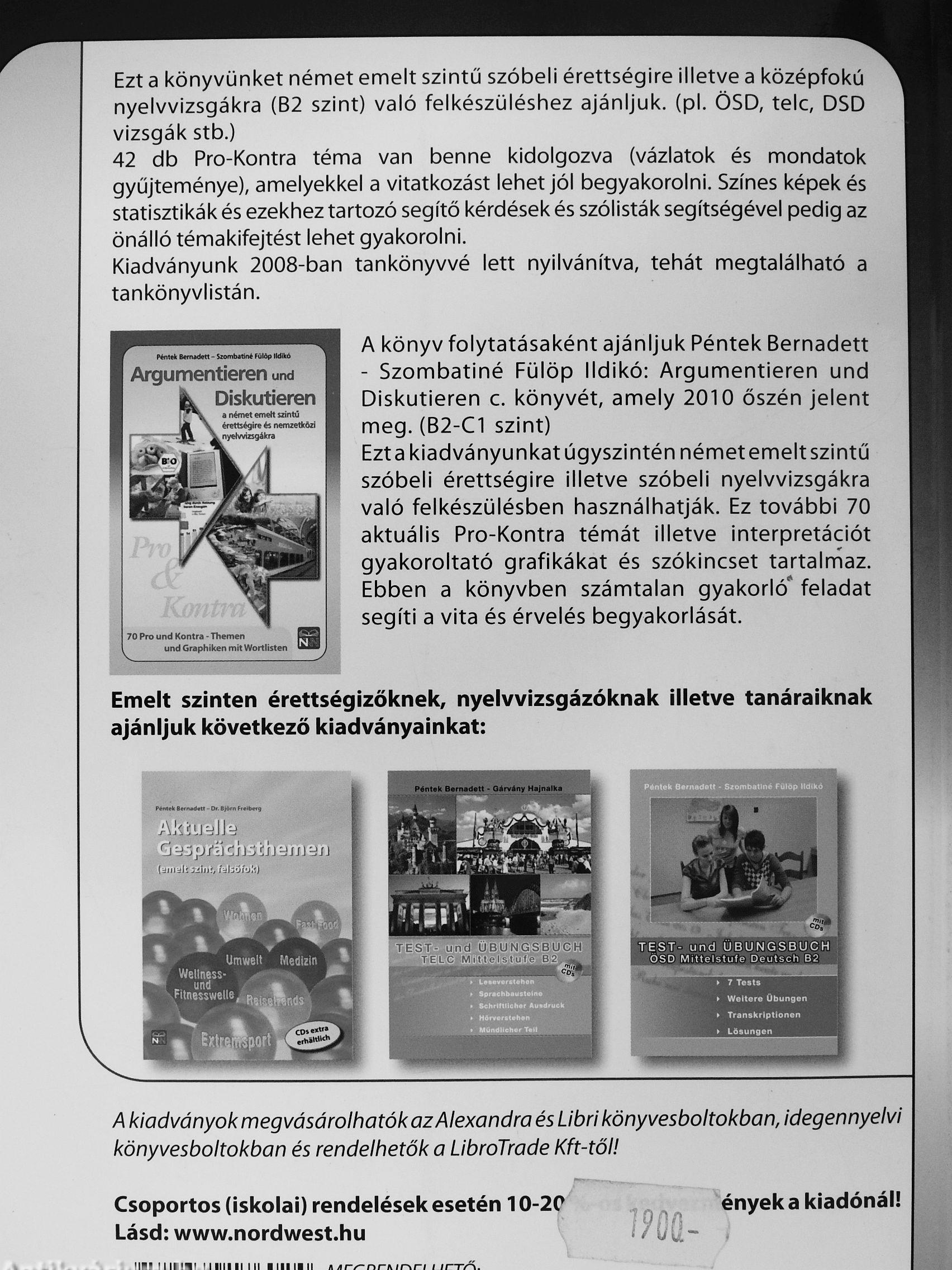 A könyv folytatásaként ajánljuk Péntek Bernadett - Szombatiné Fülöp Ildikó: Argumentieren und Diskutieren c. könyvét, amely 2010 őszén jelent meg. (B2-C1 szint)