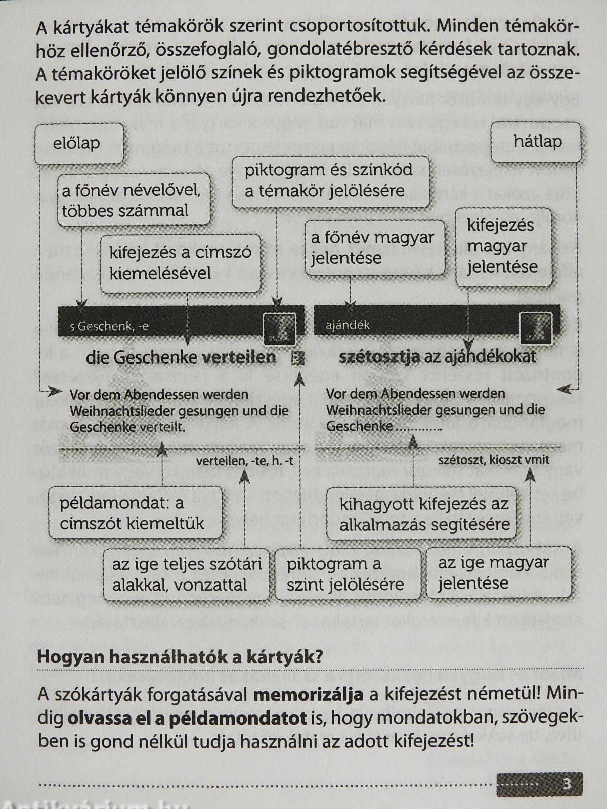 A nyelvi szókártyák mozgalmasabb, érdekesebb gyakorlást tesznek lehetővé, mint a hagyományos szószedetek és szótárak. A szókártyákkal való tanulás során szert tehet 19 témakör - ezen belül jó néhány beszélt nyelvi fordulat - alapos ismeretére, így az emelt szintű érettségi vagy a B2 szintű nyelvvizsga aligha lehet probléma. A kártyákon a példamondat a címszó kihagyásával is megtalálható: a szókincsfejlesztés a kihagyott címszó behelyettesítésével még hatékonyabbá válik. Így ellenőrizni tudja, rögzült-e az újonnan tanult szó. A különböző színű fejlécek megkönnyítik a kártyák téma szerinti csoportosítását, és segítenek egy-egy szócikk megtalálásában.