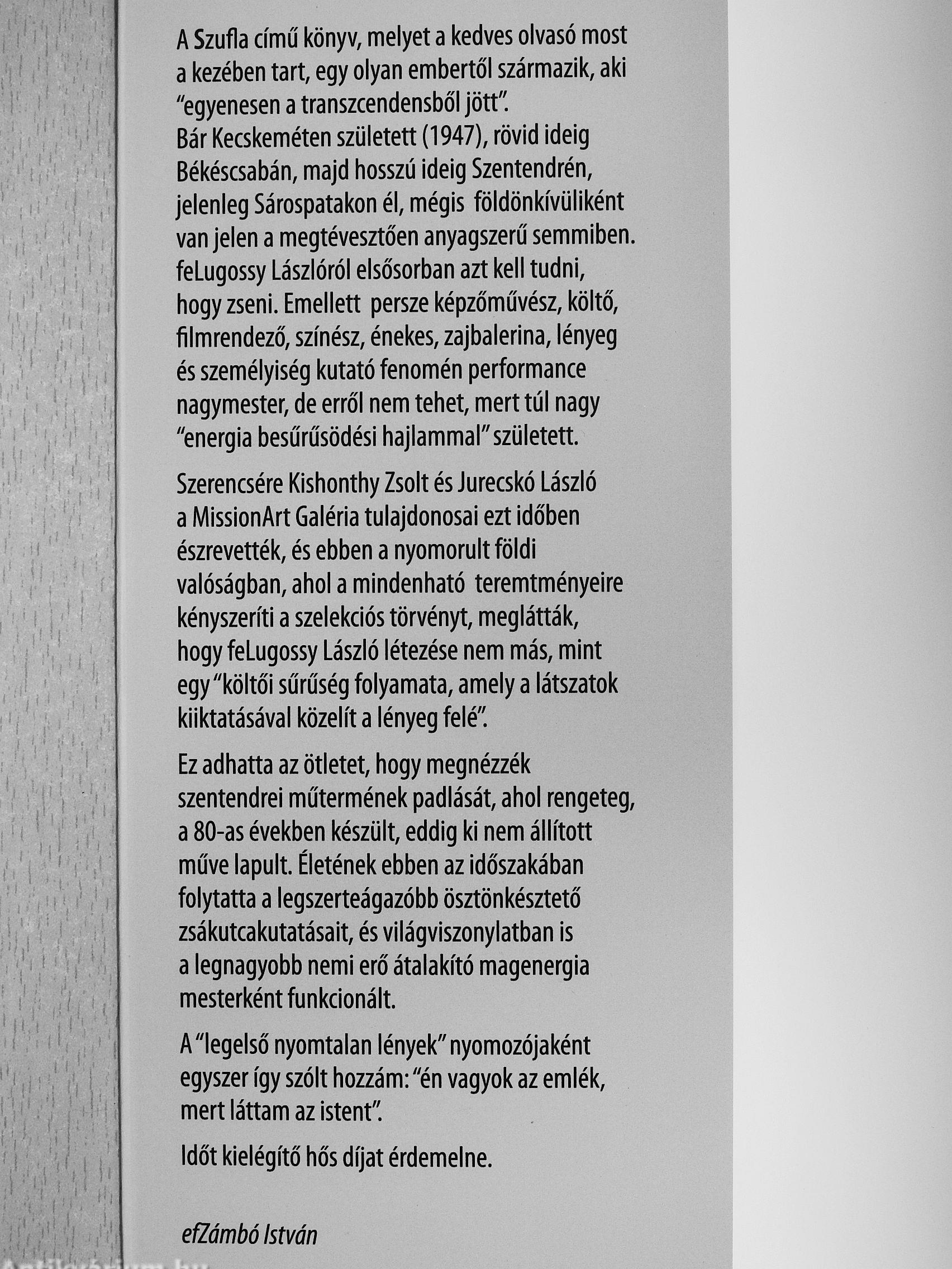 A Szufla című könyv, melyet a kedves olvasó most a kezében tart, egy olyan embertől származik, aki "egyenesen a transzcendensből jött". Bár Kecskeméten született (1947), rövid ideig Békéscsabán, majd hosszú ideig Szentendrén, jelenleg Sárospatakon él, mégis földönkívüliként van jelen a megtévesztően anyagszerű semmiben. feLugossy Lászlóról elsősorban azt kell tudni, hogy zseni. Emellett persze képzőművész, költő, filmrendező, színész, énekes, zajbalerina, lényeg és személyiség kutató fenomén performance nagymester, de erről nem tehet, mert túl nagy "energia besűrűsödési hajlammal" született.