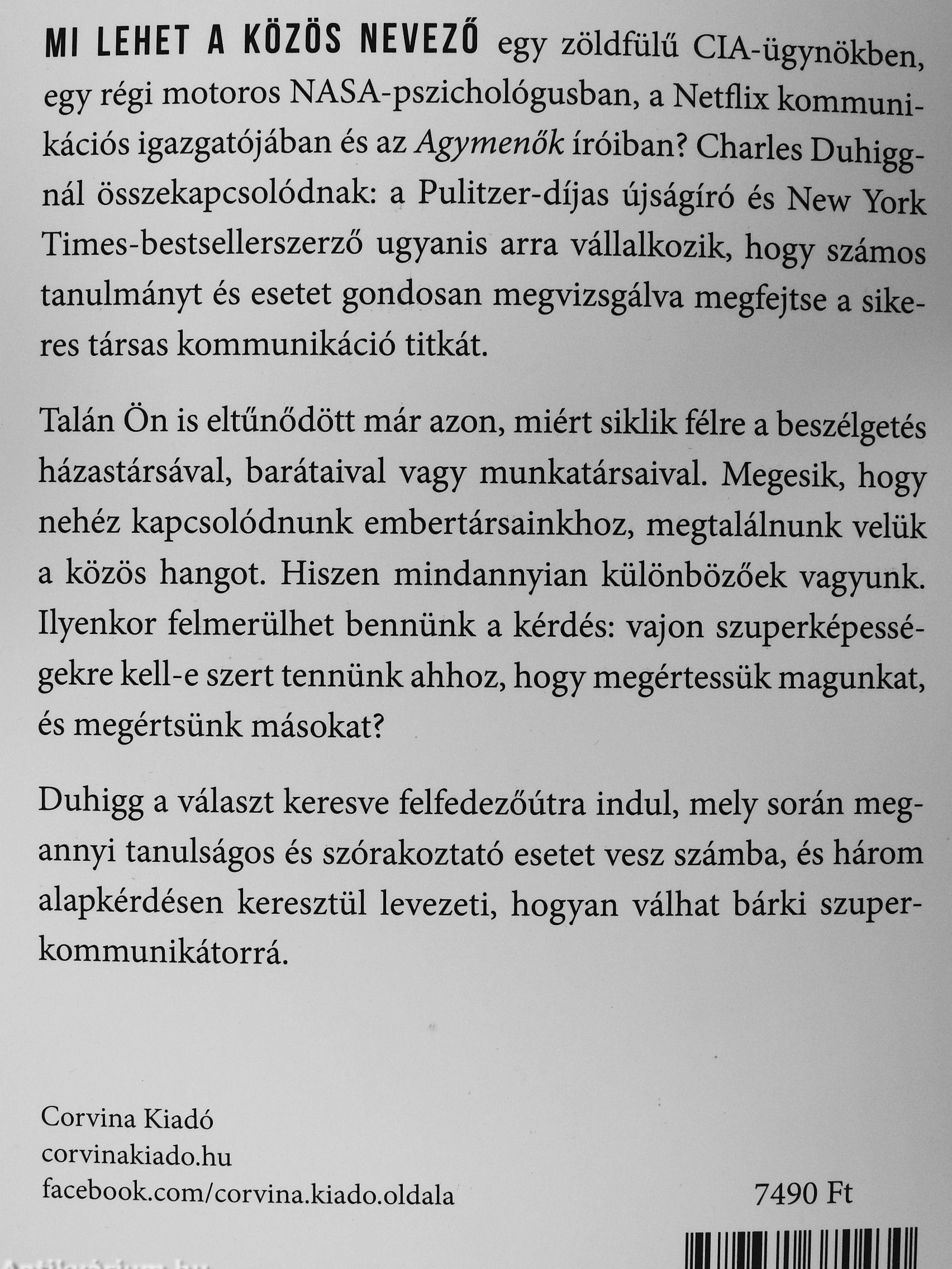Ml LEHET A KÖZÖS NEVEZŐ egy zöldfülű CIA-ügynökben, egy régi motoros NASA-pszichológusban, a Netflix kommunikációs igazgatójában és az Agymenők íróiban? Charles Duhigg-nál összekapcsolódnak: a Pulitzer-díjas újságíró és New York Times-bestsellerszerző ugyanis arra vállalkozik, hogy számos tanulmányt és esetet gondosan megvizsgálva megfejtse a sikeres társas kommunikáció titkát.