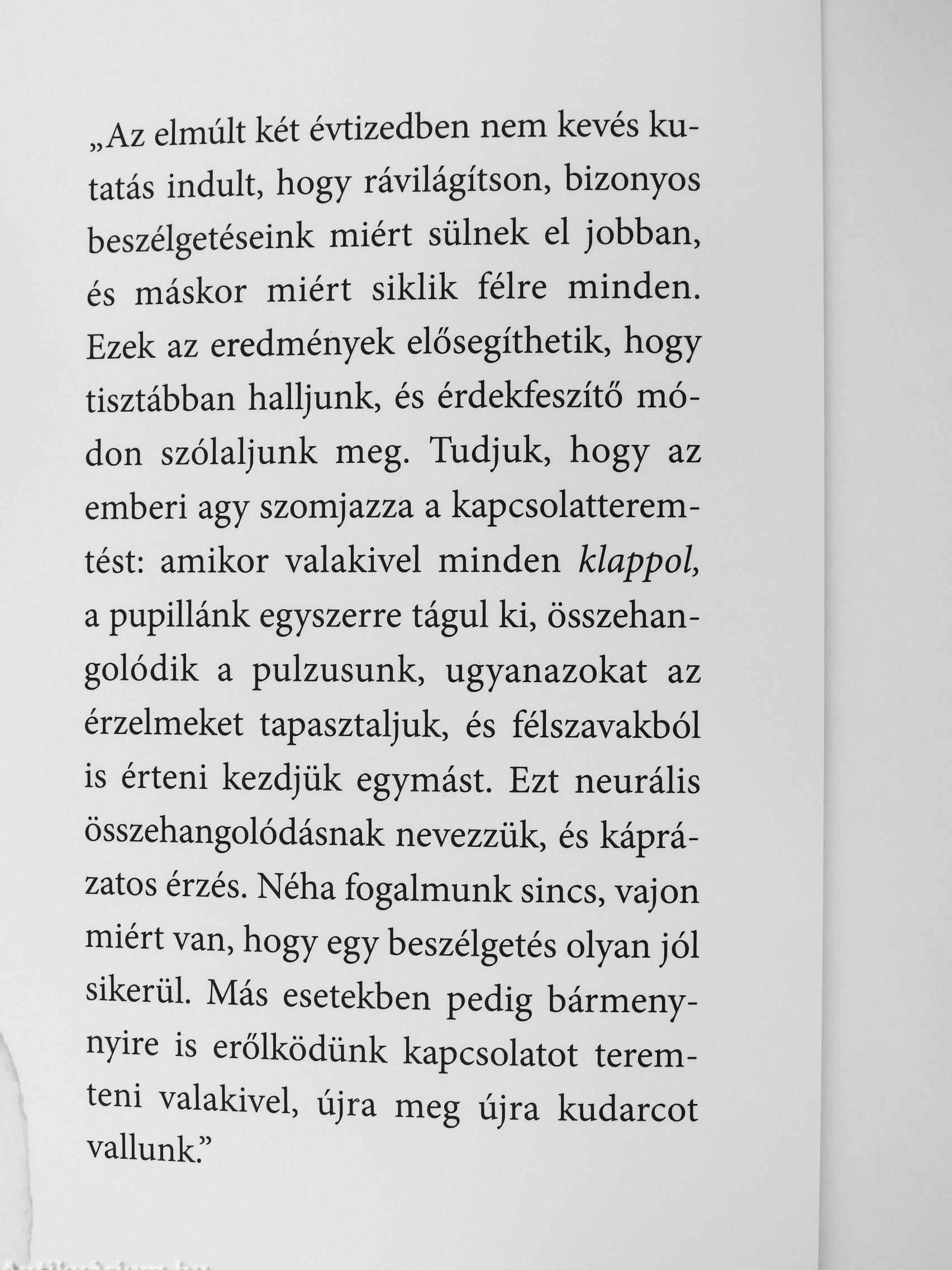 „Az elmúlt két évtizedben nem kevés kutatás indult, hogy rávilágítson, bizonyos beszélgetéseink miért sülnek el jobban, és máskor miért siklik félre minden. Ezek az eredmények elősegíthetik, hogy tisztábban halljunk, és érdekfeszítő módon szólaljunk meg. Tudjuk, hogy az emberi agy szomjazza a kapcsolatteremtést: amikor valakivel minden klappol, a pupillánk egyszerre tágul ki, összehangolódik a pulzusunk, ugyanazokat az érzelmeket tapasztaljuk, és félszavakból is érteni kezdjük egymást. Ezt neurális összehangolódásnak nevezzük, és káprázatos érzés. Néha fogalmunk sincs, vajon miért van, hogy egy beszélgetés olyan jól sikerül. Más esetekben pedig bármenynyire is erőlködünk kapcsolatot teremteni valakivel, újra meg újra kudarcot vallunk."