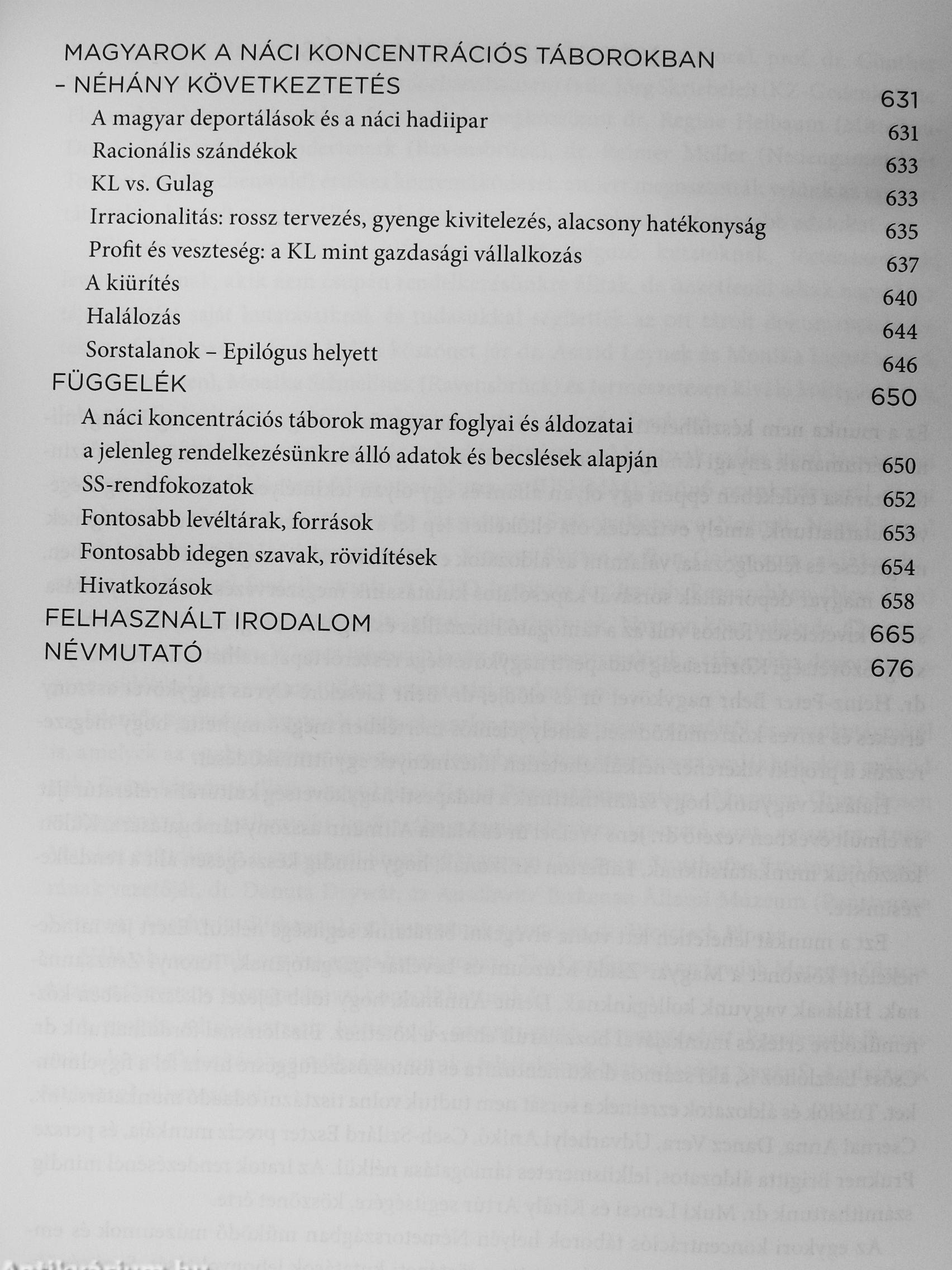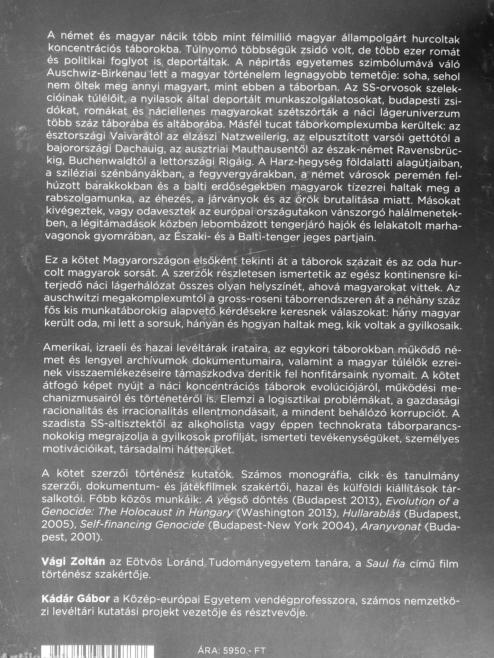 Amerikai, izraeli és hazai levéltárak irataira, az egykori táborokban.működő német és lengyel archívumok dokumentumaira, valamint a magyar túlélők ezreinek visszaemlékezéseire támaszkodva derítik fel honfitársaink nyomait. A kötet átfogó képet nyújt a náci koncentrációs táborok evolúciójáról, működési mechanizmusairól és történetéről is. Elemzi a logisztikai problémákat, a gazdasági racionalitás és irracionalitás ellentmondásait, a mindent behálózó korrupciót. A szadista SS-altlsztektől az alkoholista vagy éppen technokrata táborparancsnokokig megrajzolja a gyilkosok profilját, Ismerteti tevékenységüket, személyes motivációikat, társadalmi hátter>üket.
