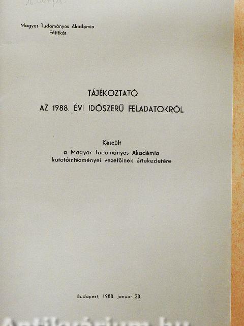 Az Akadémia kutatóintézetei, szolgáltató szervei és vállalatai igazgatóinak, párttitkárainak, SZB- és KISZ-titkárainak szokásos évi értekezletére 1988. január 28-án kerül sor. Meghívást kaptak erre az Akadémia testületi szerveinek és Központi Hivatalának vezető munkatársai, valamint a felsőbb párt- és állami irányító szervek, a Közalkalmazottak Szakszervezete, s a kutatás-fejlesztés irányításában leginkább érdekelt tárcák (országos hatáskörű szervek) vezetői is.