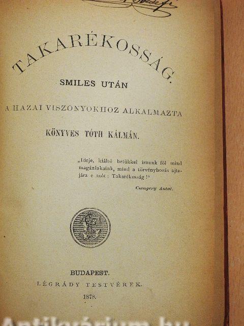 Smiles egy hozzám sajátkezüleg irt levelében azon nézetét nyilvánitá, hogy jelen mű kizárólag angol viszonyokkal foglalkozik s más nemzet fiait nem érdekelheti. S valóban, a mint művét átolvastam, sokáig haboztam, ha vájjon az „Önsegély" és „Jellem" után közrebocsássam-e a „Takarékosság"-ot. Ugy, a mint eredetiben van, a magyar közönségre nézve nem lehetett volna közvetlen hatású. Megkisérlettem tehát azon a nyomon haladni, mint azt az „Önsegély" s „Jellem" átültetésénél tettem. Lehetnek s vannak, kik ez eljárást nem helyeslik, mert a felhozott magyar példákat - mint ama másik két műnél is - kicsinylik; de kérem, ne feledjék el, hogy kicsiny teremben kisebb világosság is kellő fényt áraszthat; ne feledjék el, hogy e mű nem politikai ügyekkel foglalkozik , azért ennek lapjain minden pártárnyalat férfiai békejobbot nyújtanak egymásnak , mihelyt nemes példájok által az emberi s nemzeti előhaladás jótékony előharczosai.