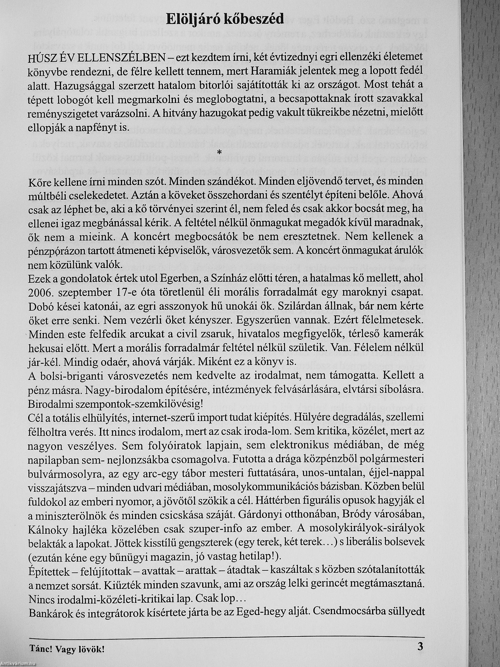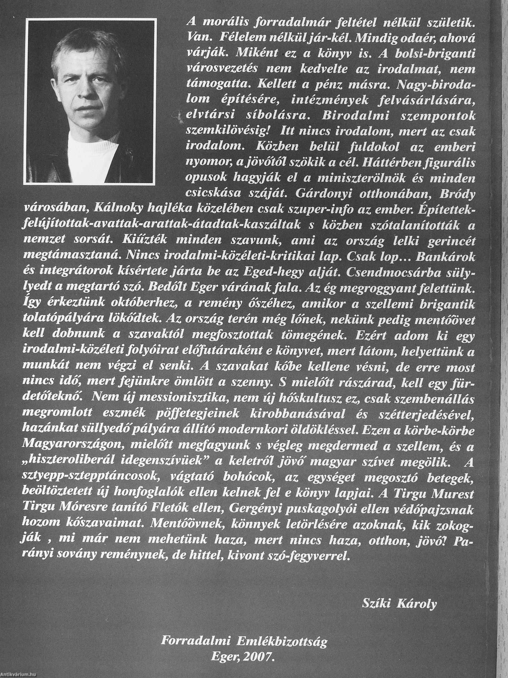 nyomor, ajövó'től szökik a cél. Háttérben figurális opusok hagyják el a miniszterölnök és minden csicskása száját. Gárdonyi otthonában, Bródy városában, Kálnoky hajléka közelében csak szuper-info az ember. Építettek-felíyítottak-avattak-arattak-átadtak-kaszáltak s ködfen szótalanították a nemzet sorsát. Kiűzték minden szavunk, ami az ország lelki gerincét megtámasztaná. Nincs irodalmi-közéleti-kritikai lap. Csak lop Bankárok és integrátorok kísértete járta be az Eged-hegy alját. Csendmocsárba süly-lyedt a megtartó szó. Bedóít Eger várának fala. Az ég megroggyant felettünk, így érkeztünk októberhez, a remény őszéhez, amikor a szellemi brigantik tolatópályára lökődtek. Az ország terén még lőnek, nekünk pedig mentőövet kell dobnunk a szavaktól megfosztottak tömegének. Ezért adom ki egy irodalmi-közéleti folyóirat előfutáraként e könyvet, mert látom, helyettünk a munkát nem végzi el senki. A szavakat kőbe kellene vésni, de erre most nincs idő', mert fejünkre ömlött a szenny. S mielőtt rászárad, kell egy für-detőtekno. Nem új messionisztika, nem ty hőskultusz ez, csak szembenállás megromlott eszmék pöffetegjeinek kirobbanásával és szétterjedésével, hazánkat süllyedő'pályára állító modemkori öldökléssel. Ezen a körbe-körbe Magyarországon, mielőtt megfagyunk s végleg megdermed a szellem, és a „hiszteroliberál idegenszívüek" a keletről jövő' magyar szívet megölik. A sztyepp-sztepptáncosok, vágtató bohócok, az egységet megosztó betegek, beöltöztetett új honfoglalók ellen kelnek fel e könyv lapjai. A Tirgu Murest Tirgu Móresre tanító Fletók ellen, Gergényi puskagolyói ellen védőpajzsnak hozom kó'szavaimat. Mentőövnek, könnyek letörlésére azoknak, kik zokogják , mi már nem mehetünk haza, mert nincs haza, otthon, jövő! Parányi sovány reménynek, de hittel, kivont szó-fegyverrel.
