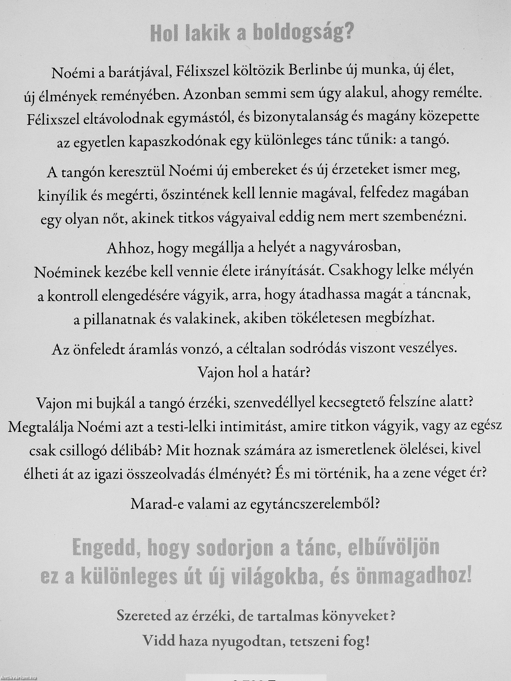Vajon mi bujkál a tangó érzéki, szenvedéllyel kecsegtető felszíne alatt? Megtalálja Noémi azt a testi-lelki intimitást, amire titkon vágyik, vagy az egész csak...