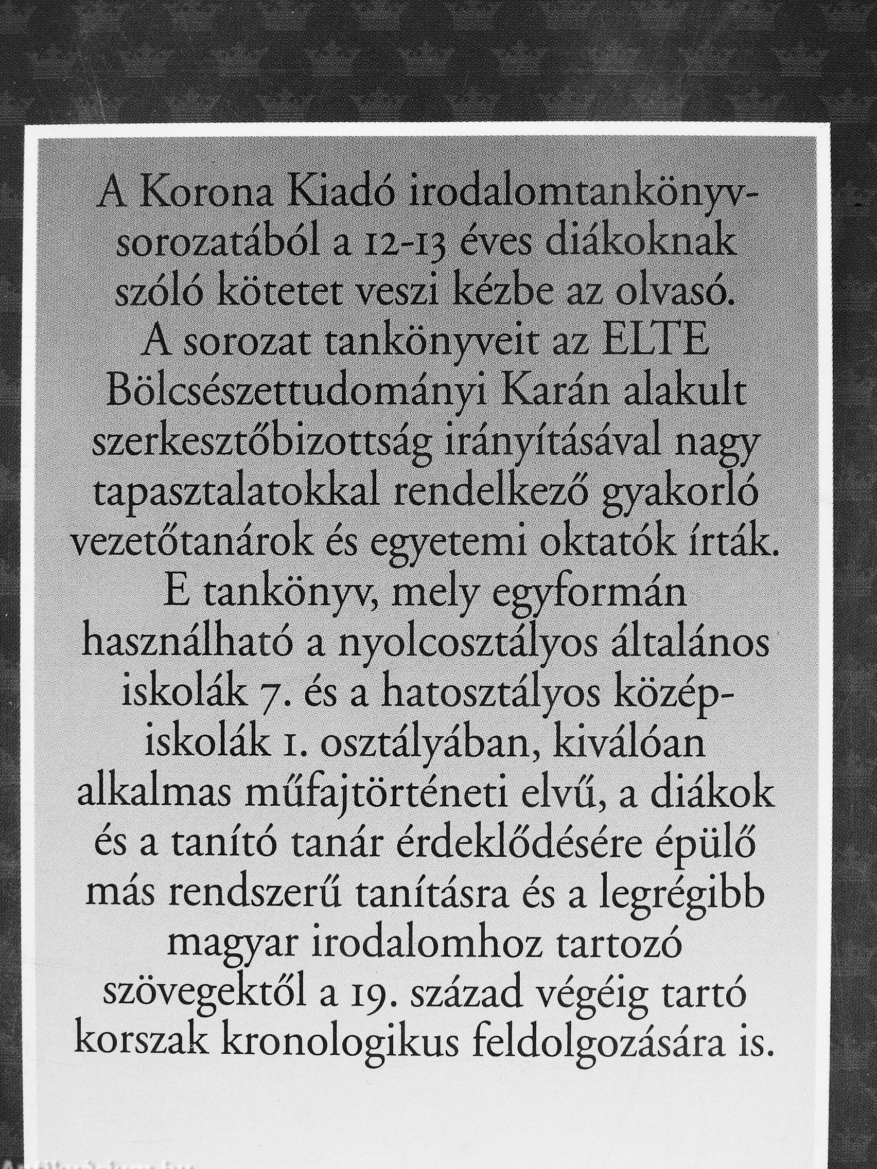 A Korona Kiadó irodalomtankönyvsorozatából a 12-13 diákoknak szóló kötetet veszi kézbe az olvasó.