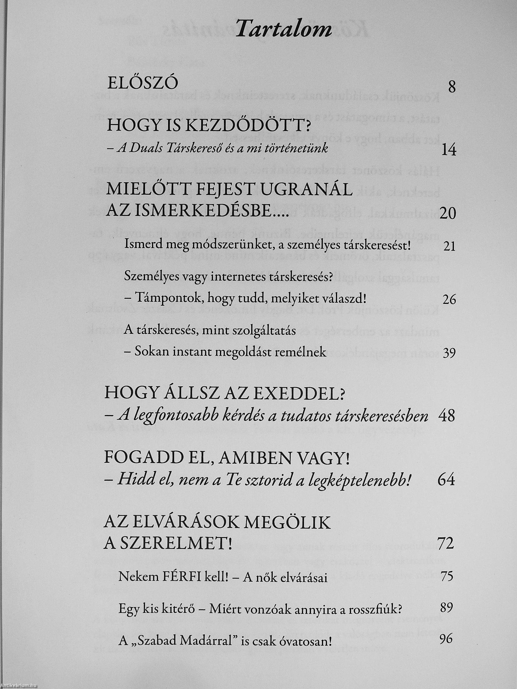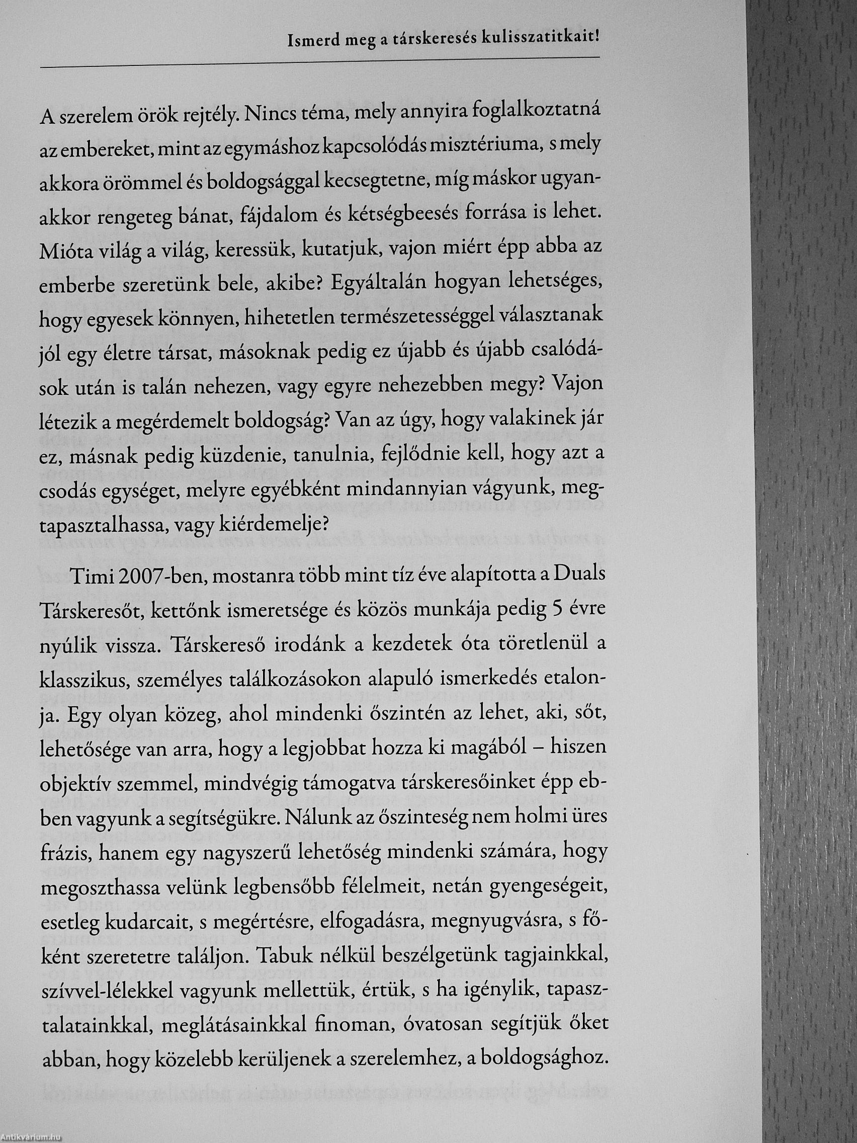 A Duals Társkeresőben 11 éve foglalkozunk társkeresőkkel. Több ezer embert segítettünk, kísértünk figyelemmel személyesen a szerelemre találásban, s a rengeteg élet írta történettel a birtokunkban bóven van hát miről mesélnünk, hogy mindez tanulsággal szolgálhasson akár Neked is. Ha szeretnéd tudni, mi minden zajlik manapság társkeresés néven az ismerkedésben, ez a könyv a Te könyved lesz! Érdekes sztorik, hihetetlennek tűnő és humoros randevútörténetek, na és persze nem kevés segítség áll majd rendelkezésedre ahhoz, hogy tudatosan, de legfőképp boldogságra ítélten lépj színre eztán az ismerkedésben!