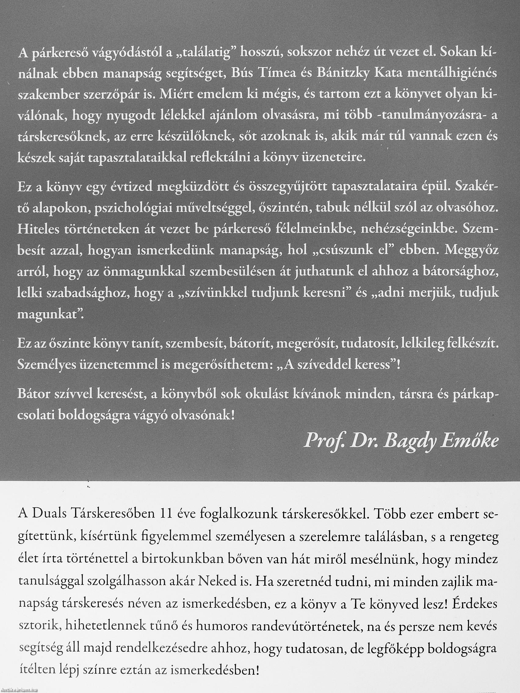 A párkereső vágyódástól a „találatig" hosszú, sokszor nehéz út vezet el. Sokan kínálnak ebben manapság segítséget, Bús Tímea és Bánitzky Kata mentálhigiénés szakember szerzőpár is. Miért emelem ki mégis, és tartom ezt a könyvet olyan kiválónak, hogy nyugodt lélekkel ajánlom olvasásra, mi több -tanulmányozásra- a társkeresőknek, az erre készülőknek, sőt azoknak is, akik már túl vannak ezen és készek saját tapasztalataikkal reflektálni a könyv üzeneteire.