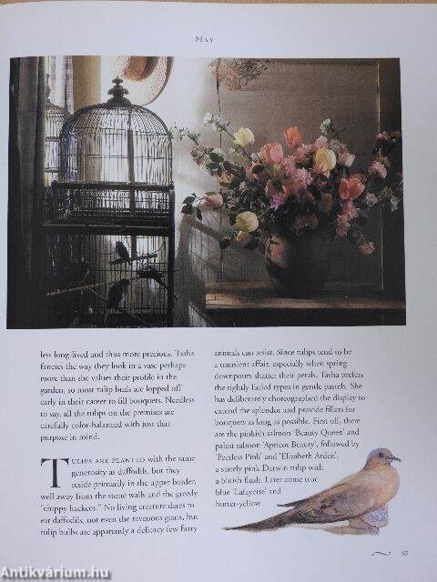 "Paradise on earth" is how Tasha describes her garden, and along with the flowers and the vegetables that provide her food, her paradise is filled with an enchanting menagerie - corgies, Nubian goats, cats, chickens, fantail doves, and forty or more exotic finches, cockatieis, canaries, nightingales, and parrots, which inhabit her collection of antique cages.