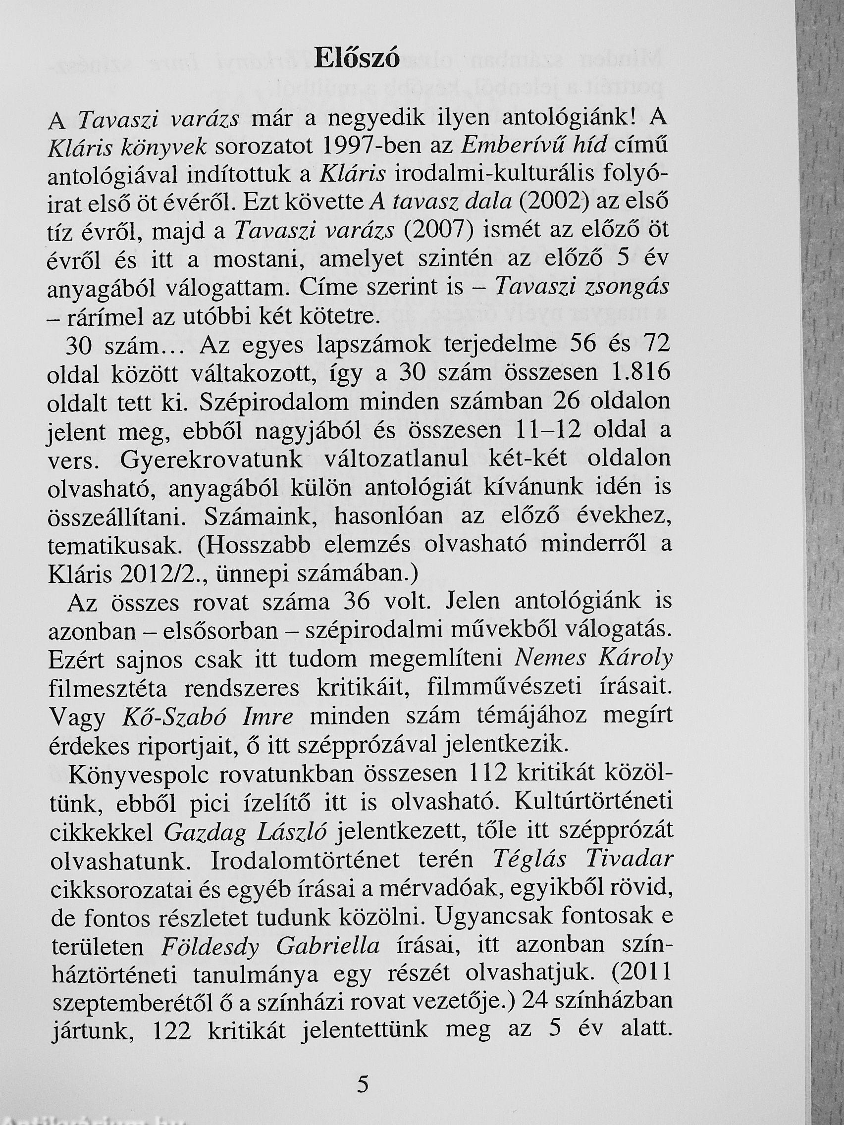 A Tavaszi varázs már a negyedik olyan antológiánk, mely válogatást közöl a Kláris című irodalmi-kulturális folyóirat anyagából. 2012 áprilisában 20 éves a lap, ez a válogatás a 2077/2-2012/1. számokból készült (összesen 30 lapszám). Az összes rovat száma 36 volt.
