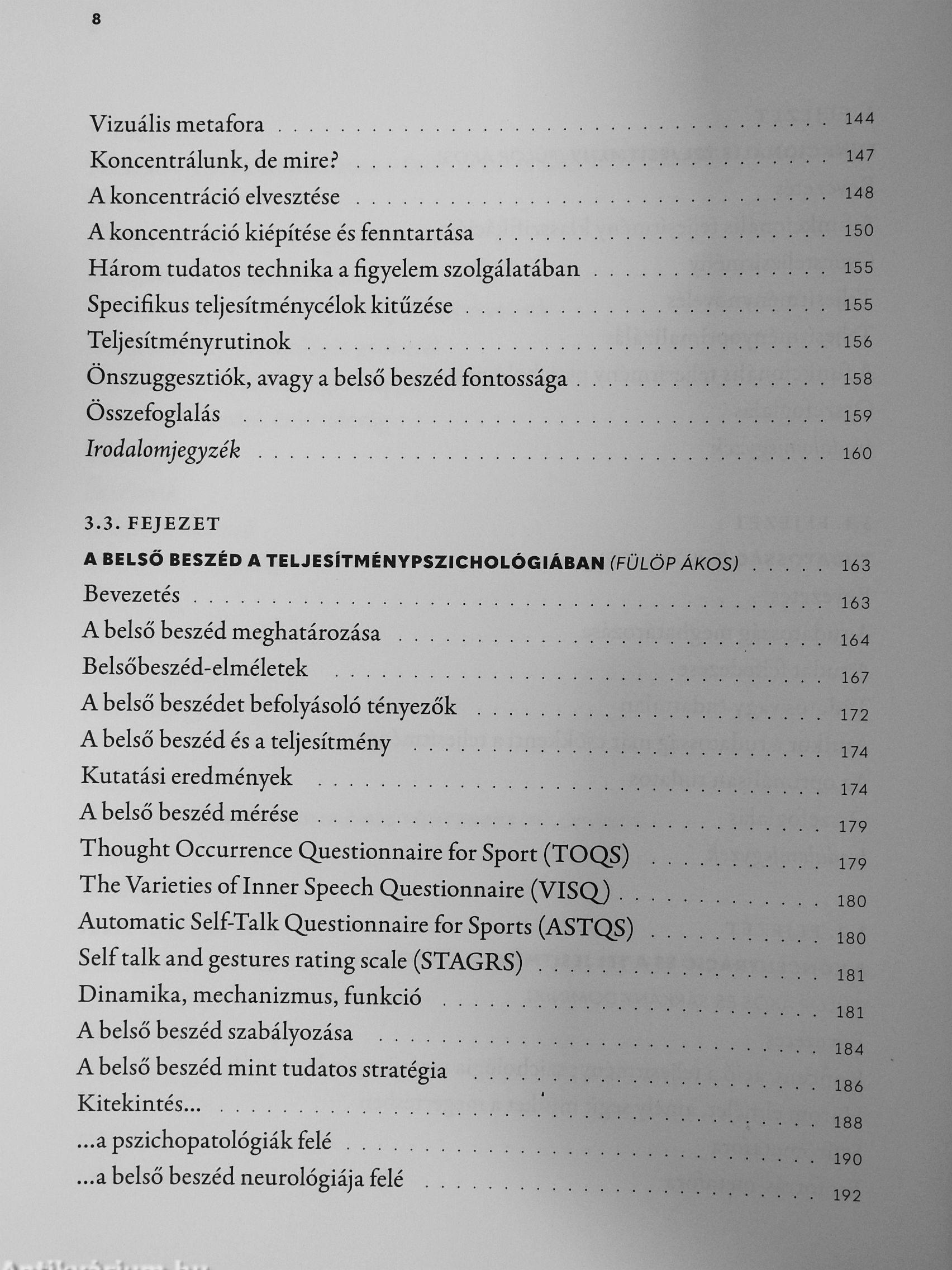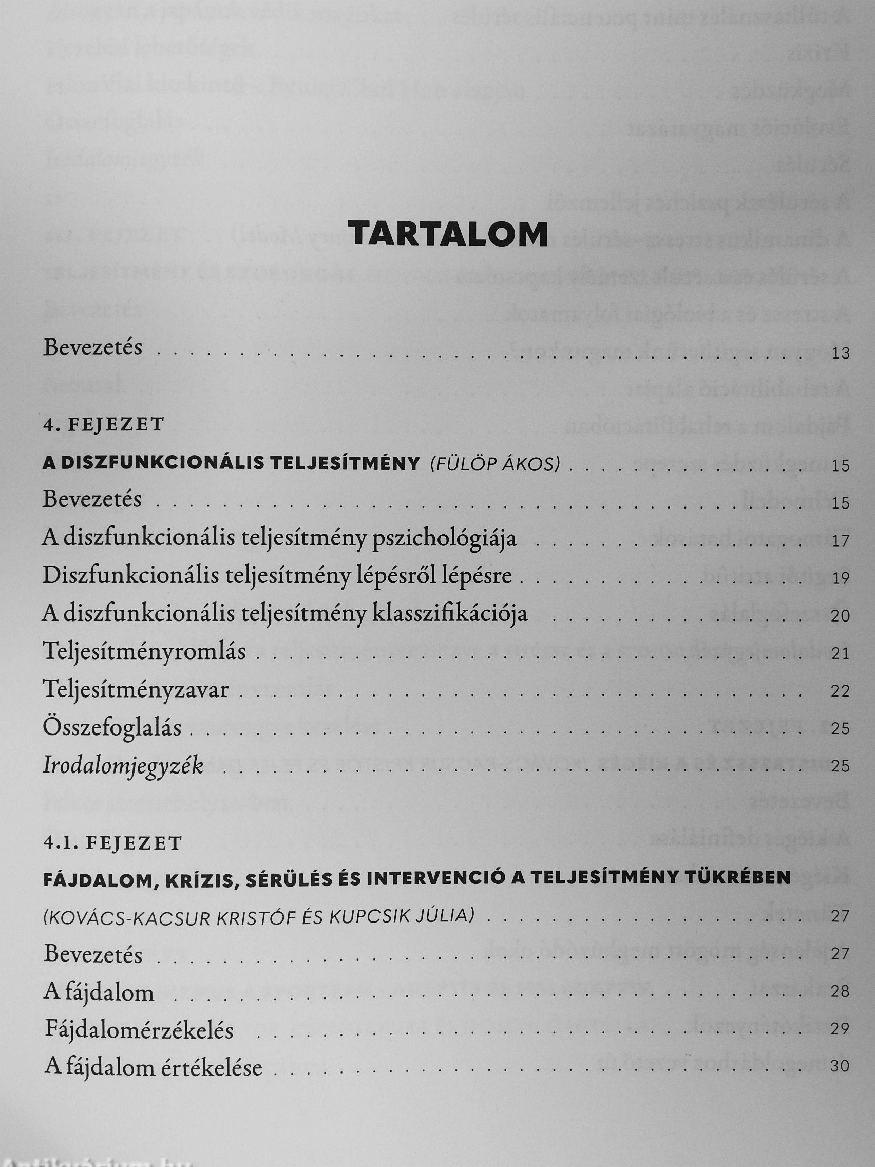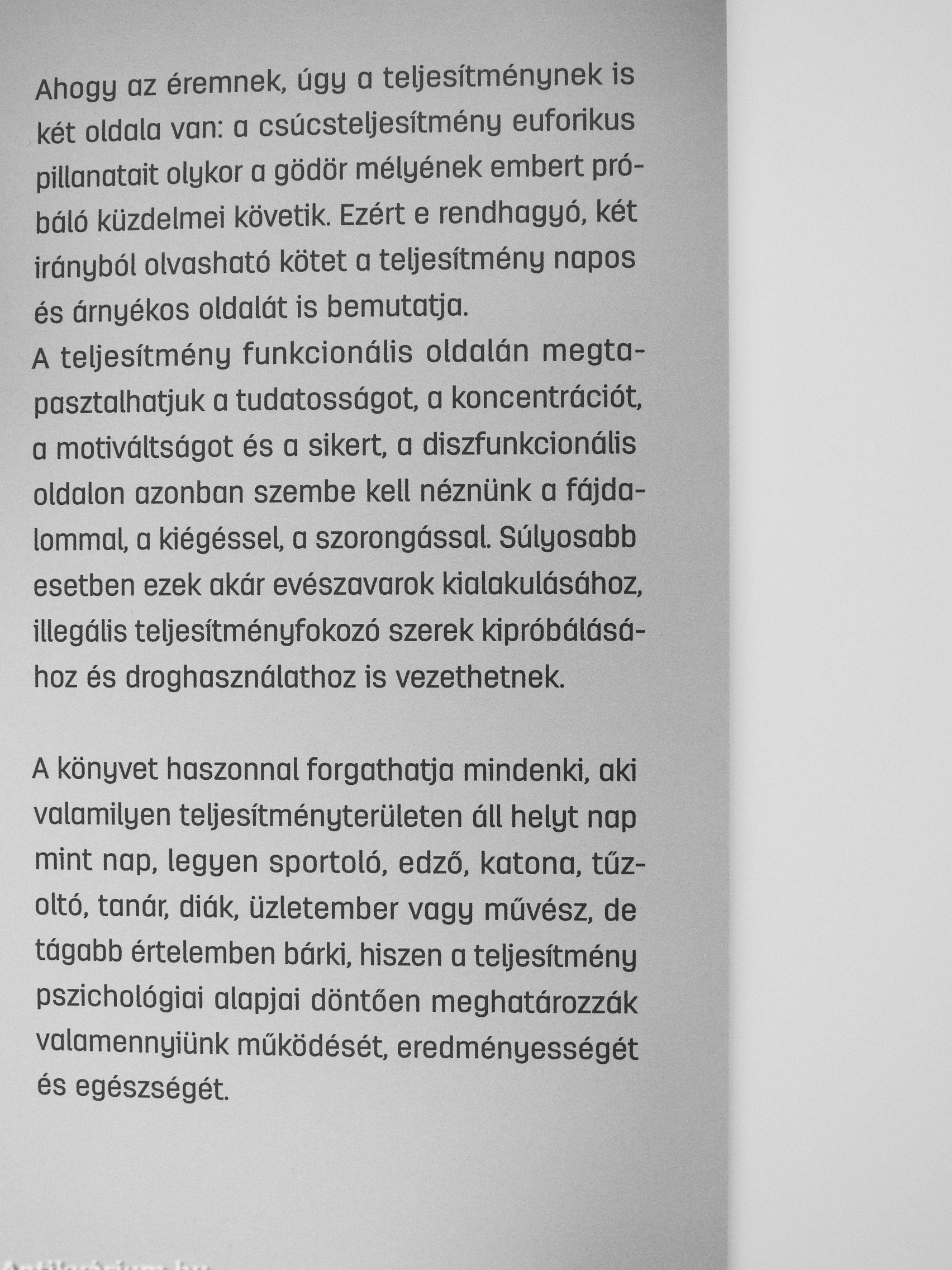 Ahogy az éremnek, úgy a teljesítménynek is két oldala van: a csúcsteljesítmény eufórikus pillanatait olykor a gödör mélyének embert próbáló küzdelmei követik. Ezért e rendhagyó, két irányból olvasható kötet a teljesítmény napos és árnyékos oldalát is bemutatja. A teljesítmény funkcionális oldalán megtapasztalhatjuk a tudatosságot, a koncentrációt, a motiváltságot és a sikert, a diszfunkcionálls oldalon azonban szembe kell néznünk a fájdalommal, a kiégéssel, a szorongással. Súlyosabb esetben ezek akár evészavarok kialakulásához, illegális teljesítményfokozó szerek kipróbálásához és droghasználathoz is vezethetnek.