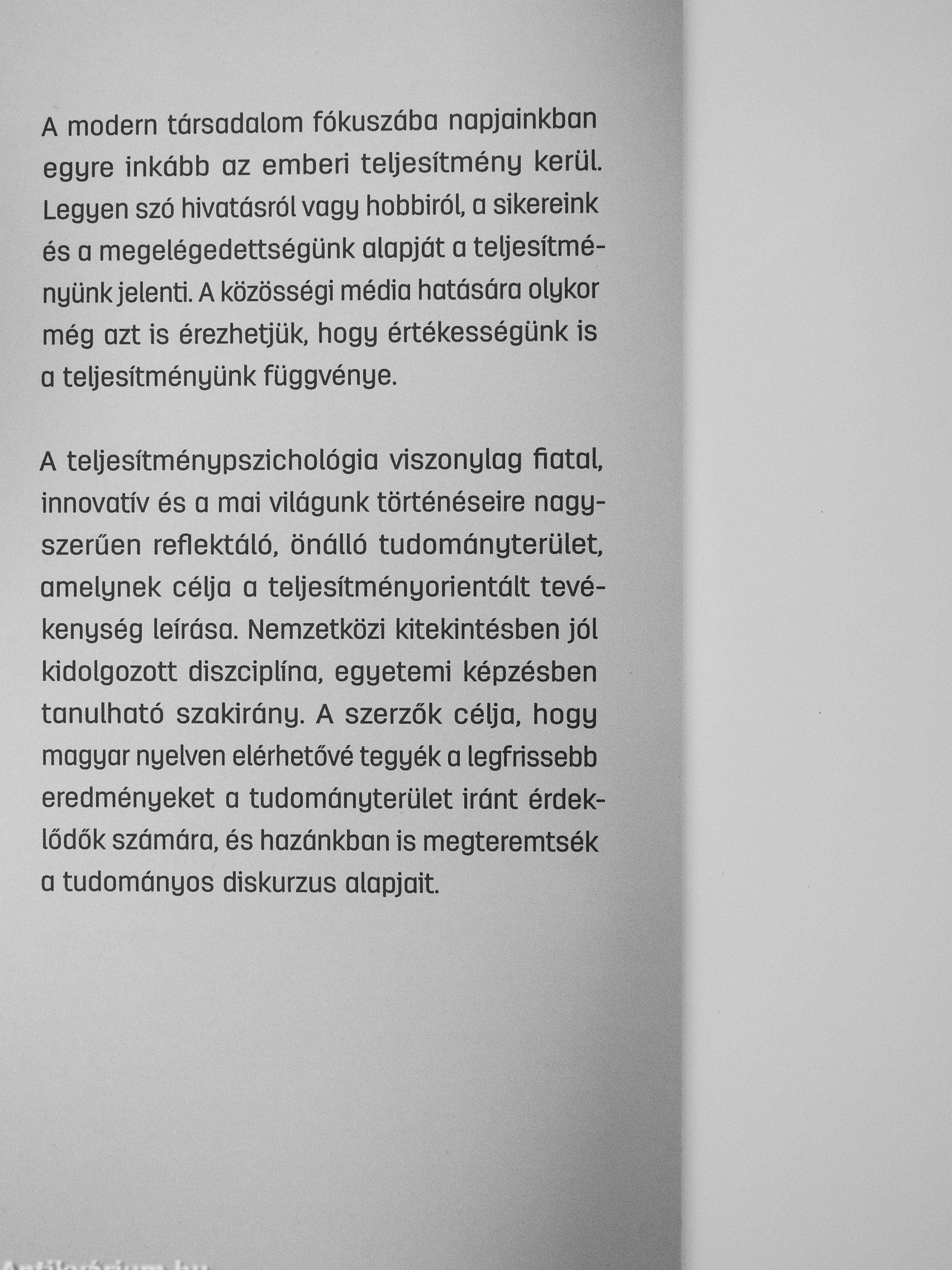 A teljesítménypszicholőgia viszonylag fiatal, innovatív és a mai világunk történéseire nagyszerűen reflektáló, önálló tudományterület, amelynek célja a teljesítményorientált tevékenység leírása. Nemzetközi kitekintésben jól kidolgozott diszciplína, egyetemi képzésben tanulható szakirány. A szerzők célja, hogy magyar nyelven elérhetővé tegyék a legfrissebb eredményeket a tudományterület iránt érdeklődők számára, és hazánkban is megteremtsék a tudományos diskurzus alapjait.