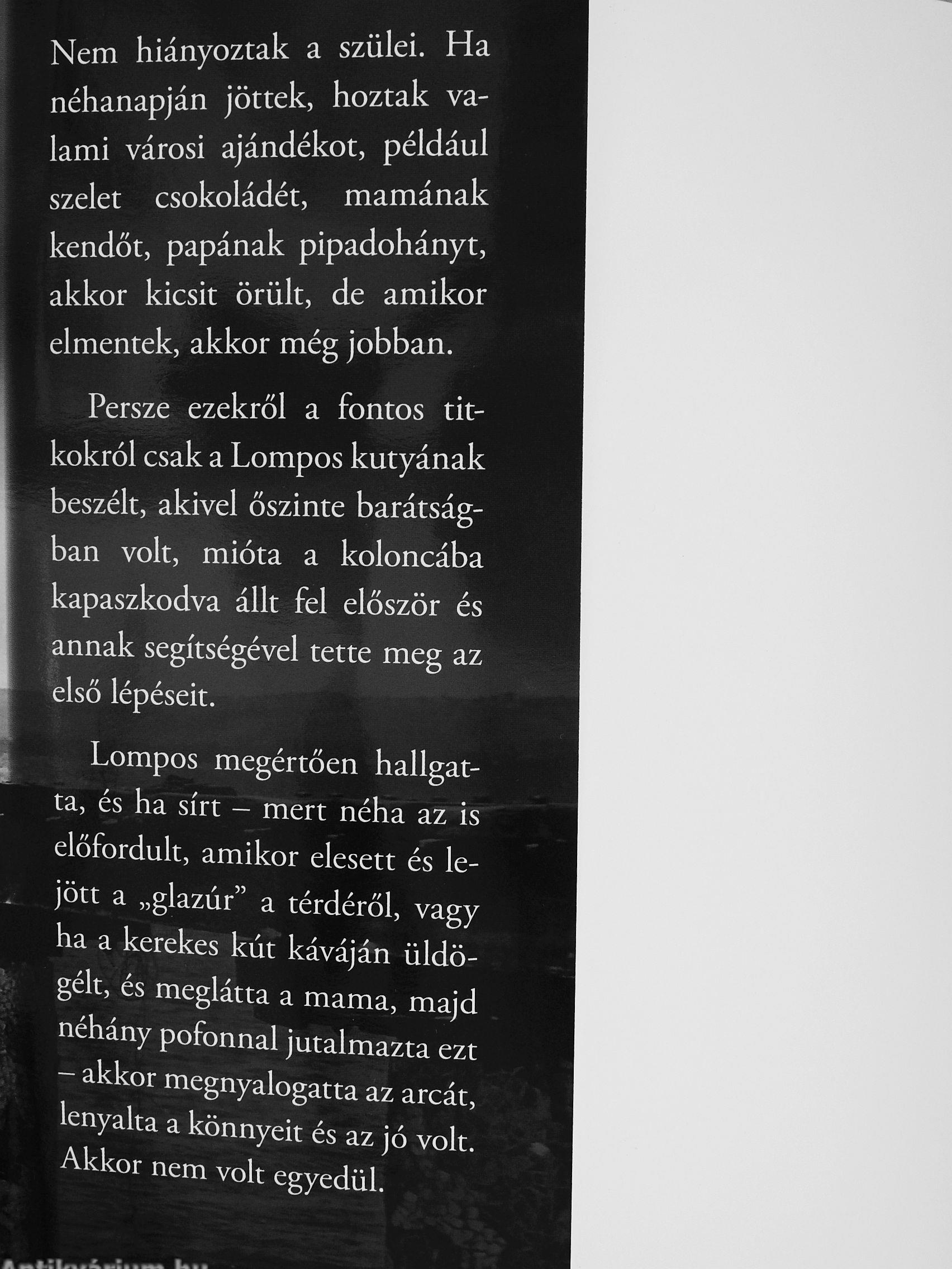 Lompos megértően hallgatta, és ha sírt - mert néha az is előforduk, amikor elesett és lejött a „glazúr" a térdéről, vagy ha a kerekes kút káváján üldö-gék, és meglátta a mama, majd néhány pofonnal jutalmazta ezt - akkor megnyalogatta az arcát, lenyalta a könnyeit és az jó volt. Akkor nem volt eevediil