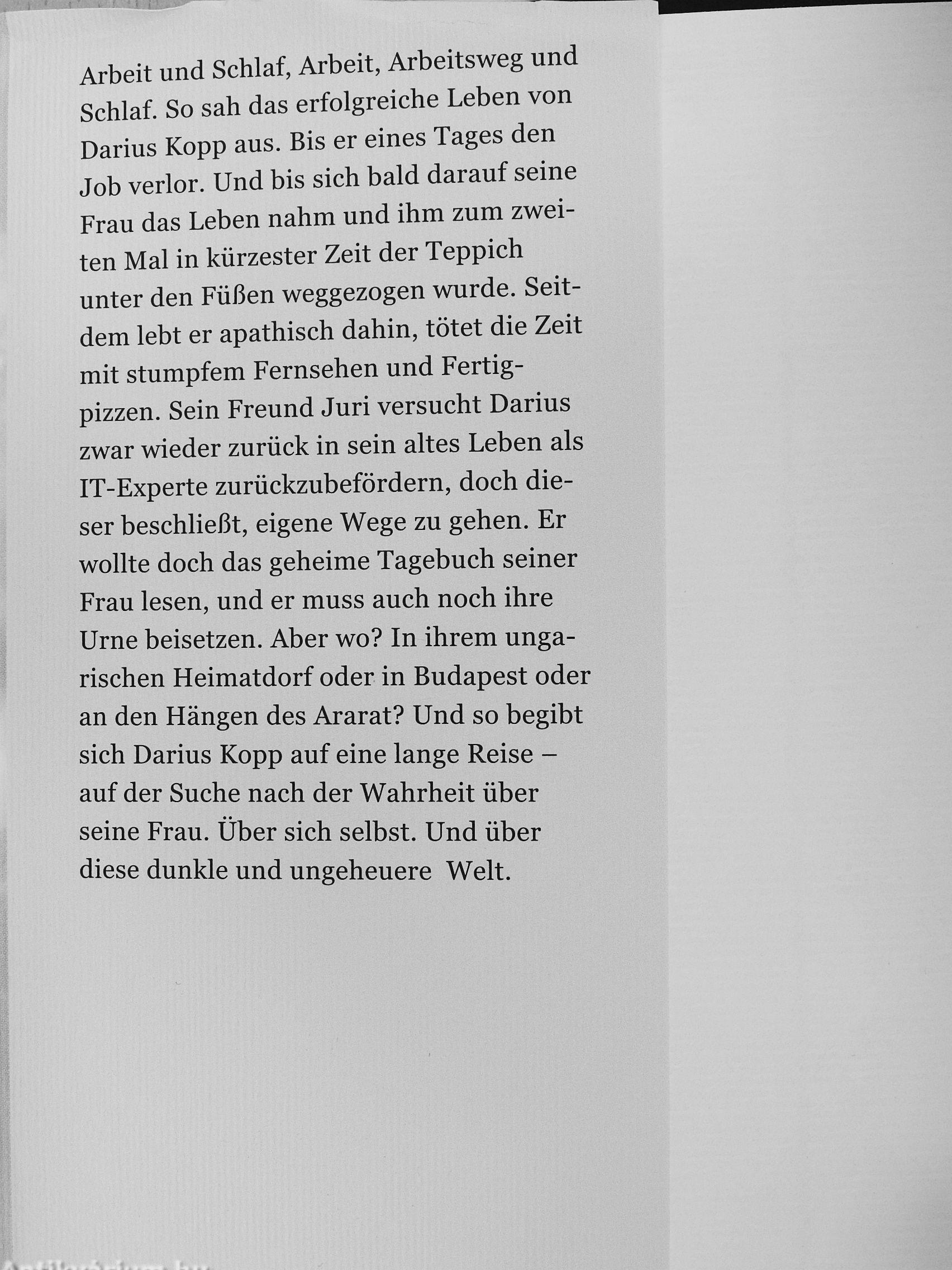 Arbeit und Schlaf, Arbeit, Arbeitsweg und Schlaf. So sah das erfolgreiche Leben von Darias Kopp aus. Bis er eines Tages den Job verlor. Und bis sich bald darauf seine Frau das Leben nahm und ihm zum zweiten Mal in kürzester Zeit der Teppich unter den Füßen weggezogen vmrde. Seitdem lebt er apathisch dahin, tötet die Zeit mit stumpfem Fernsehen und Fertigpizzen. Sein Freund Juri versucht Darius zwar wieder zurück in sein altes Leben als IT-Experte zurückzubefördern, doch dieser beschließt, eigene Wege zu gehen. Er wollte doch das geheime Tagebuch seiner Frau lesen, und er muss auch noch ihre Urne beisetzen. Aber wo? In ihrem ungarischen Heimatdorf oder in Budapest oder an den Hängen des Ararat? Und so begibt sich Darius Kopp auf eine lange Reise -auf der Suche nach der Wahrheit über seine Frau. Über sich selbst. Und über diese dunkle und ungeheuere Welt.