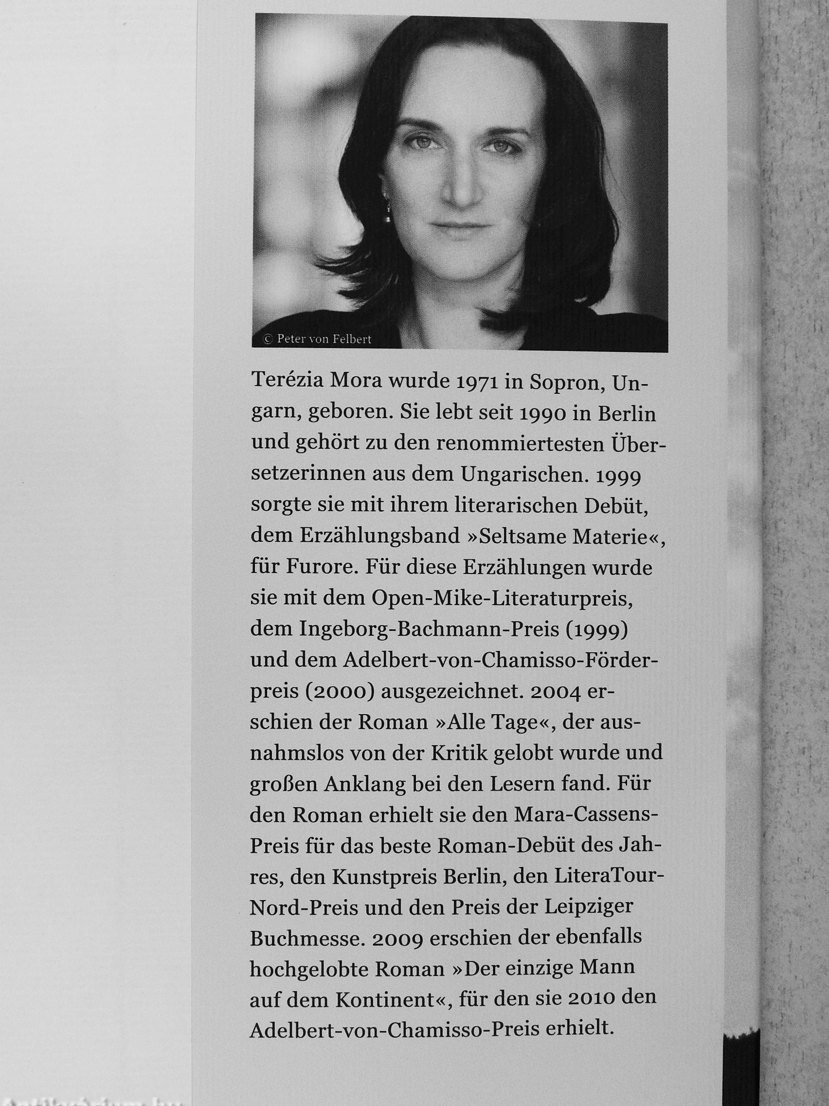Terézia Móra wurde 1971 in Sopron, Ungarn, geboren. Sie lebt seit 1990 in Berlin und gehört zu den renommiertesten Übersetzerinnen aus dem Ungarischen. 1999 sorgte sie mit ihrem literarischen Debüt, dem Erzählungsband »Seltsame Materie«, für Furore. Für diese Erzählungen wurde sie mit dem Open-Mike-Literaturpreis, dem Ingeborg-Bachmann-Preis (1999) und dem Adelbert-von-Chamisso-Förder-preis (2000) ausgezeichnet. 2004 erschien der Roman »Alle Tage«, der ausnahmslos von der Kritik gelobt wurde und großen Anklang bei den Lesern fand. Für den Roman erhielt sie den Mara-Cassens-Preis für das beste Roman-Debüt des Jahres, den Kunstpreis Berlin, den LiteraTour-Nord-Preis und den Preis der Leipziger Buchmesse. 2009 erschien der ebenfalls hochgelobte Roman »Der einzige Mann auf dem Kontinent«, für den sie 2010 den Adelbert-von-Chamisso-Preis erhielt.