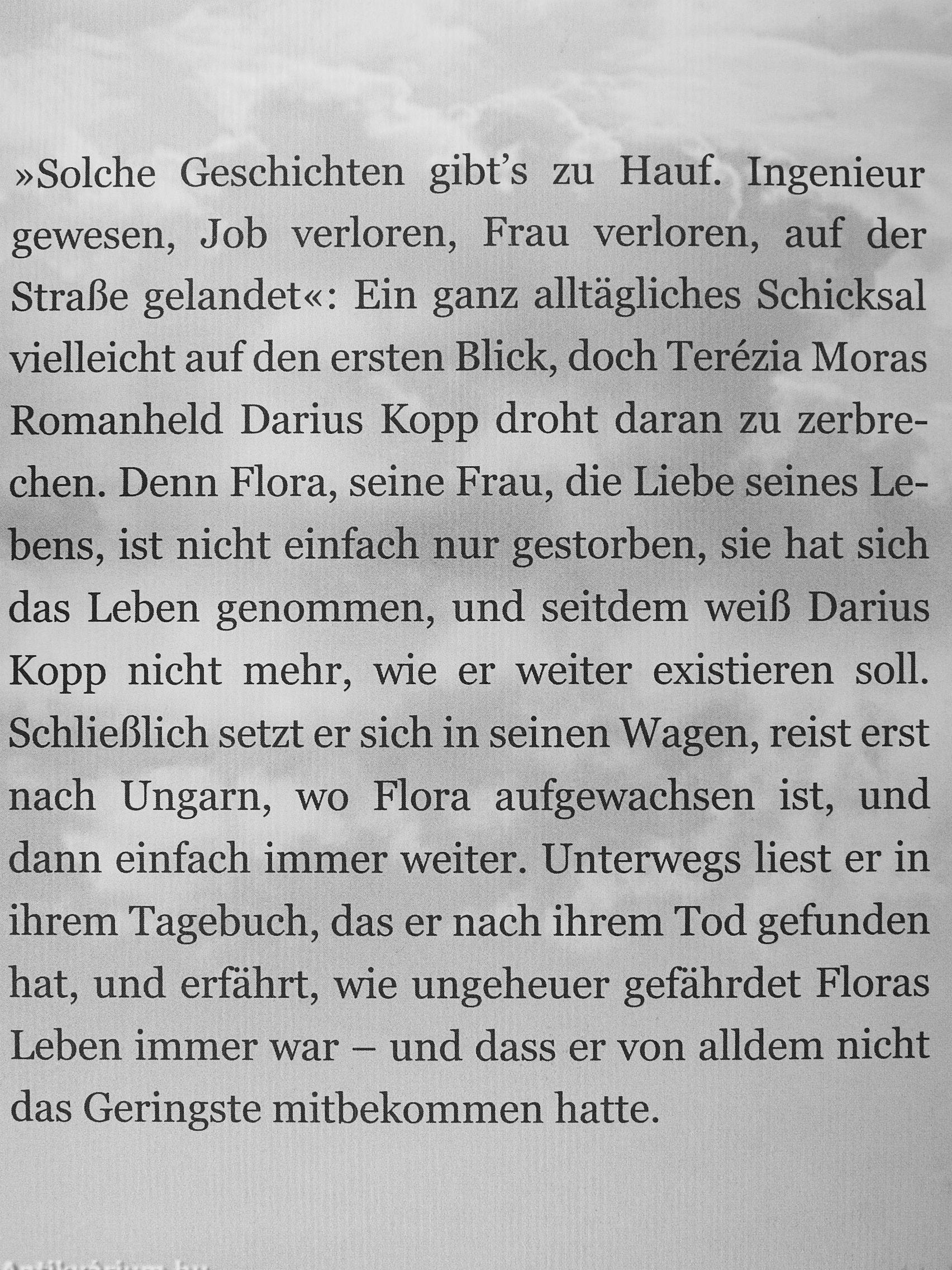 »Solche Geschichten gibt's zu Häuf. Ingenieur gewesen, Job verloren, Frau verloren, auf der Straße gelandet«: Ein ganz alltägliches Schicksal vielleicht auf den ersten Blick, doch Terézia Moras Romanheld Darius Kopp droht daran zu zerbrechen. Denn Flora, seine Frau, die Liebe seines Lebens, ist nicht einfach nur gestorben, sie hat sich das Leben genommen, und seitdem weiß Darius Kopp nicht mehr, wie er weiter existieren soll. Schließlich setzt er sich in seinen Wagen, reist erst nach Ungarn, wo Flora aufgewachsen ist, und dann einfach immer weiter. Unterwegs liest er in ihrem Tagebuch, das er nach ihrem Tod gefunden hat, und erfährt, wie ungeheuer gefährdet Floras Leben immer war - und dass er von alldem nicht das Geringste mitbekommen hatte.