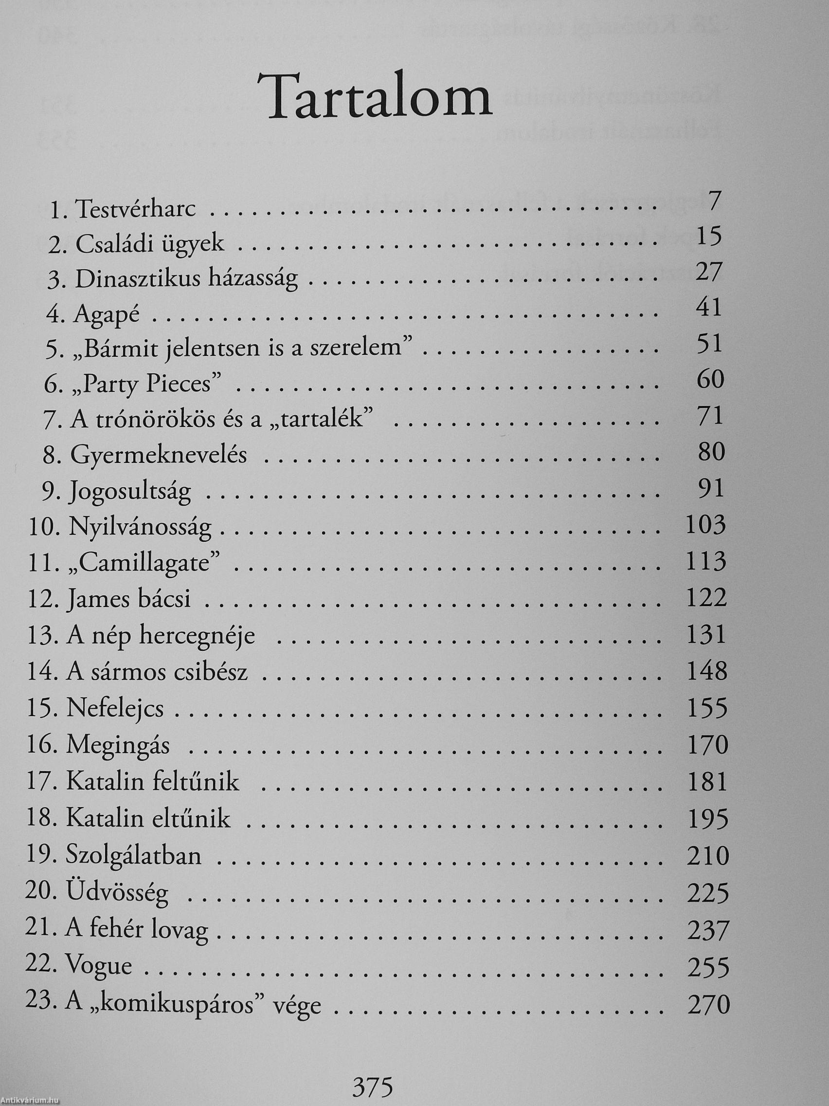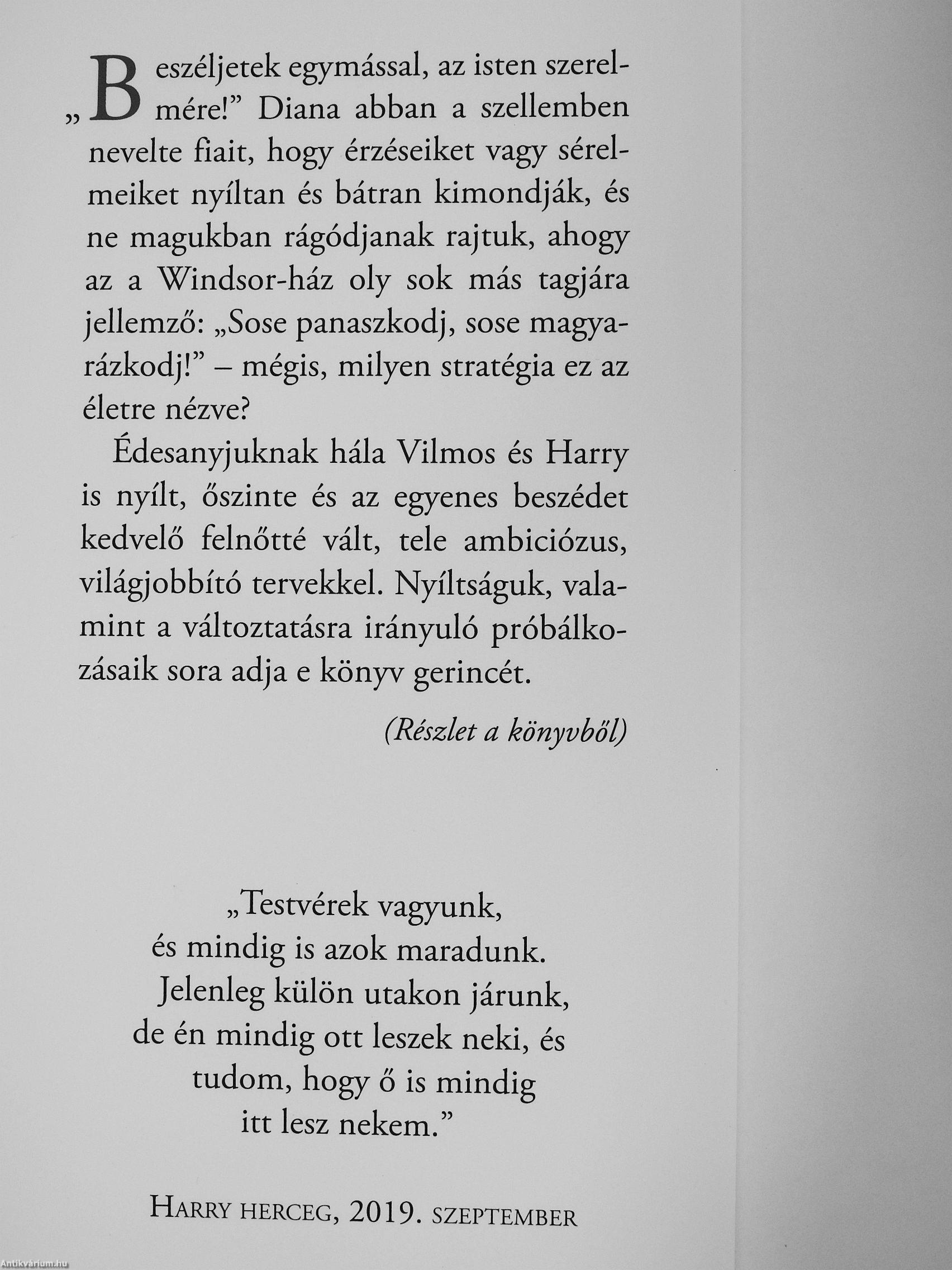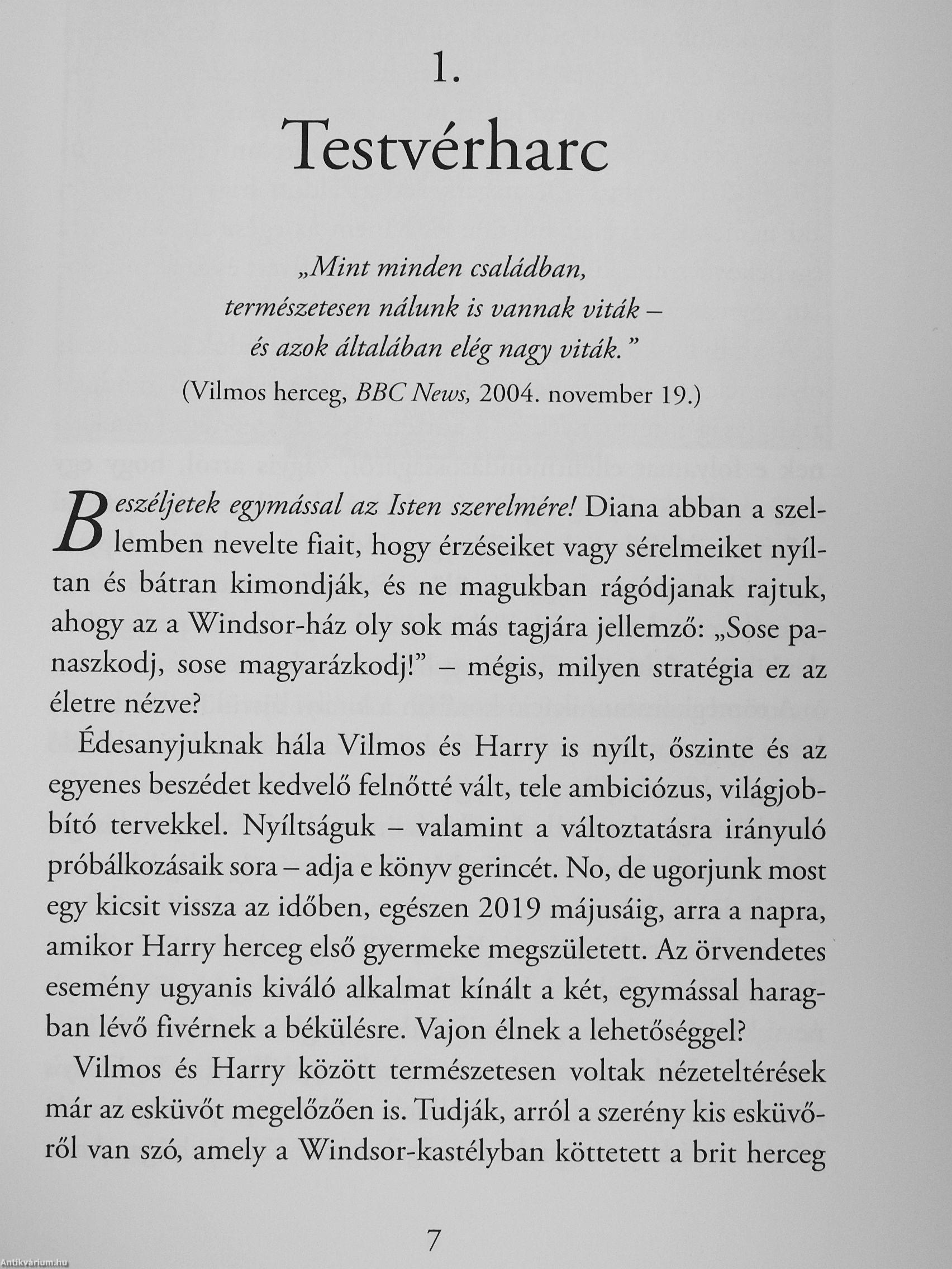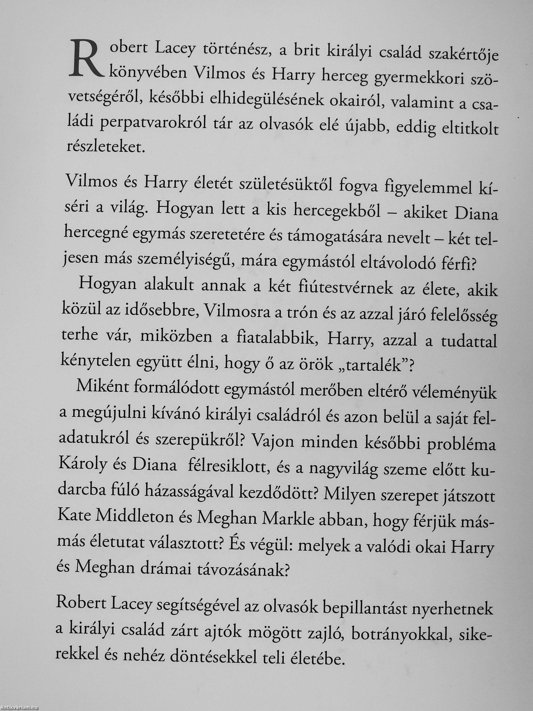 Miként formálódott egymástól merőben eltérő véleményük a megújulni kívánó királyi családról és azon belül a saját feladatukról és szerepükről? Vajon minden későbbi probléma Károly és Diana félresiklott, és a nagyvilág szeme előtt kudarcba fúló házasságával kezdődött? Milyen szerepet játszott Kate Middleton és Meghan Markié abban, hogy férjük másmás életutat választott? És végül: melyek a valódi okai Harry és Meghan drámai távozásának?
