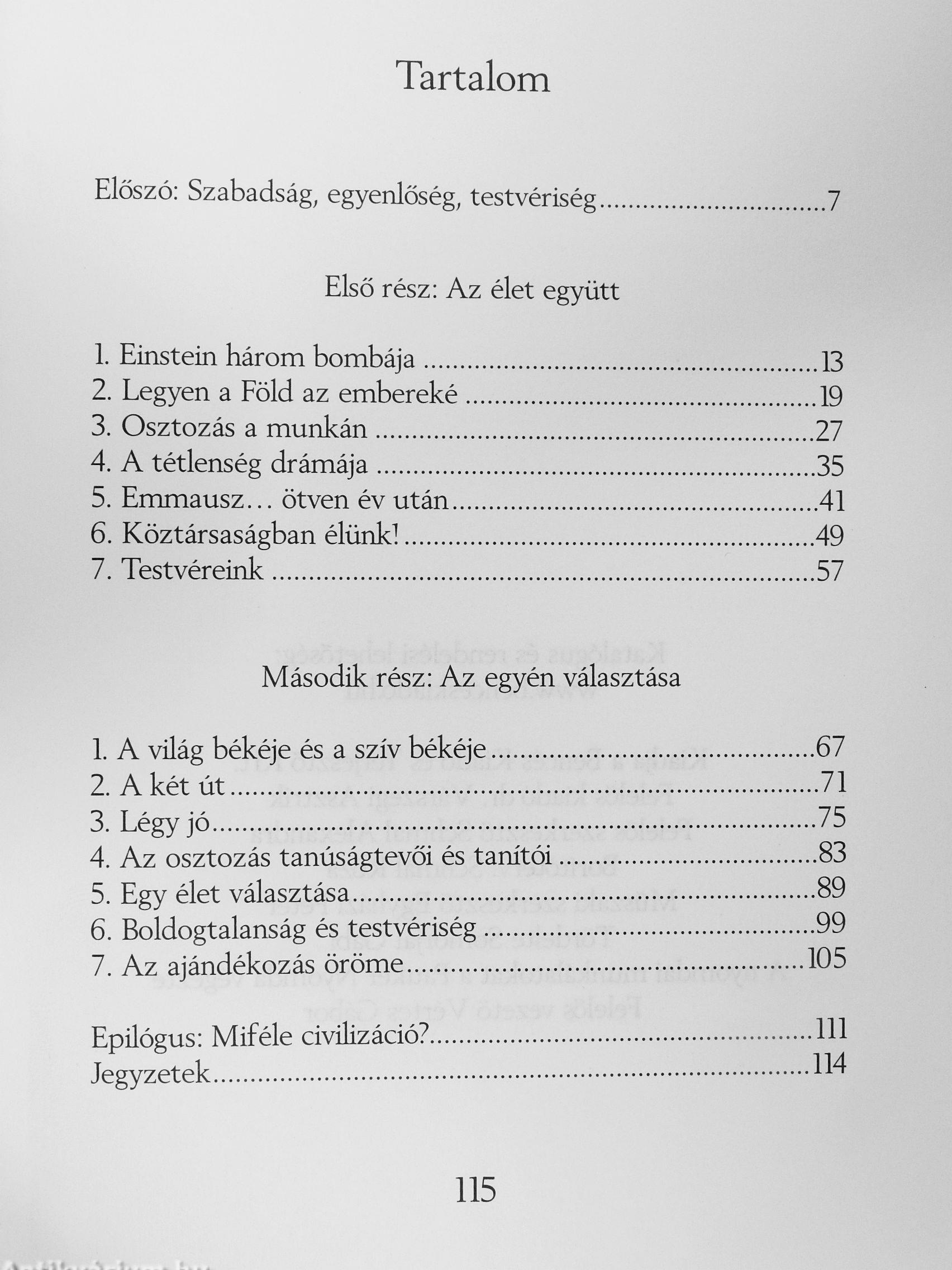 Ma, amikor az emberiség történetében először a Föld egyetlen faluvá zsugorodik, az élet új osztozásra ítél vagy szóHt fel bennünket. Meg keU tanulnunk együtt, testvérként élni, bármilyen legyen is a bőrünk színe vagy a vallásunk. Radikális döntés előtt állunk: vagy beletörődünk, hogy egy mind individuaüzáltabb és erőszakosabb, apró darabokra töredezett társadalomban élünk, vagy mindent megmozgatunk, hogy közösen egy méltányosabb, szolidárisabb és békésebb társadalmat építsünk.