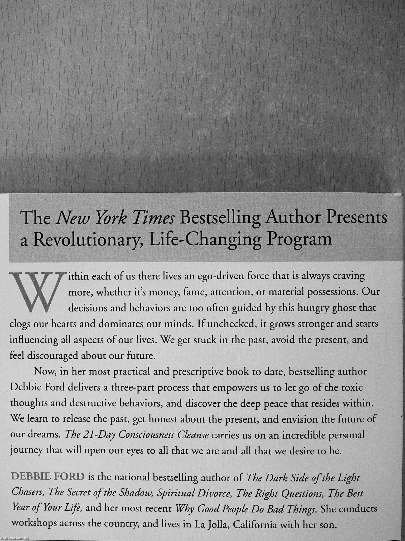 Now, in her most practical and prescriptive book to date, bestselling author Debbie Ford delivers a three-part process that empowers us to let go of the toxic thoughts and destructive behaviors, and discover the deep peace that resides within. We learn to release the past, get honest about the present, and envision the future of our dreams. The 21-Day Consciousness Cleanse carries us on an incredible personal journey that will open our eyes to all that we are and all that we desire to be.