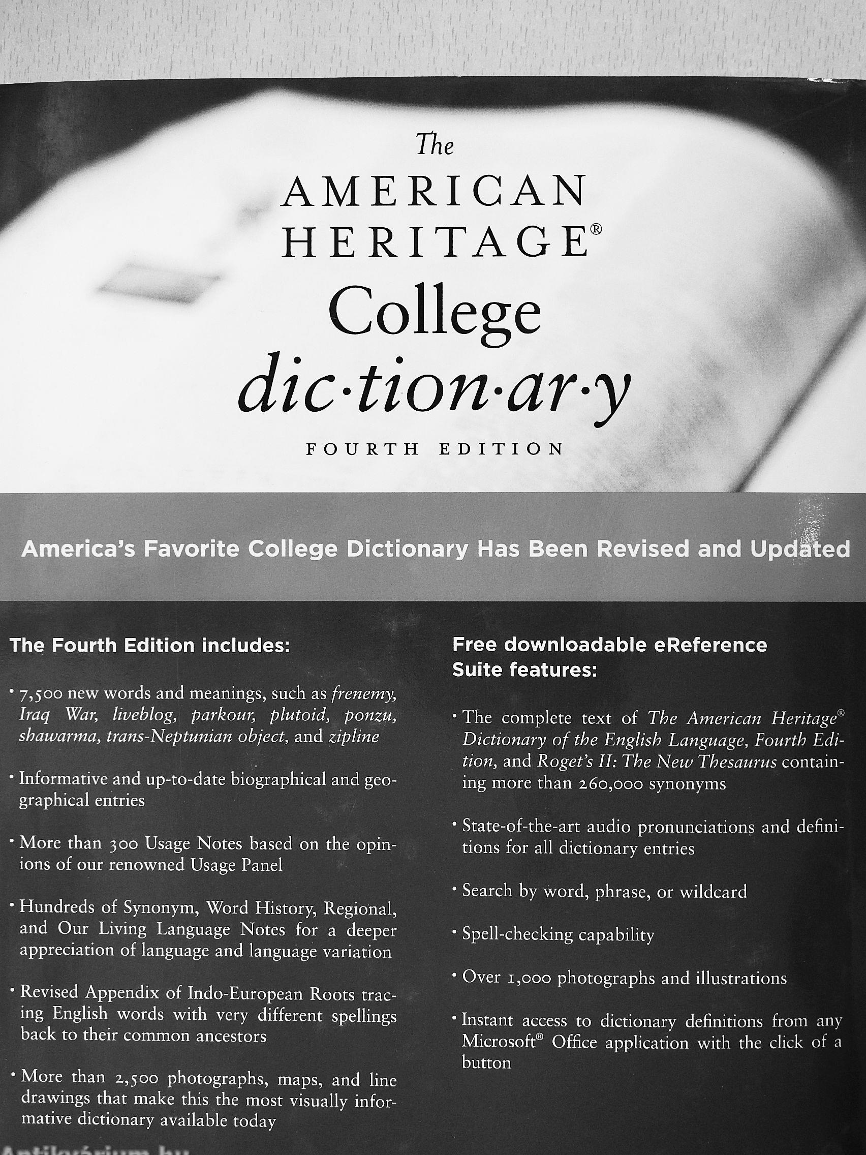 The Fourth Edition of The American Heritage® College Dictionary presents the very best that a college dictionary can offer. It features all of the qualities that have distinguished the American Heritage name for decades: a clear and accessible defining style, expert usage advice, and more than 2., 5 00 photographs and drawings that enhance the definitions and invite browsing.