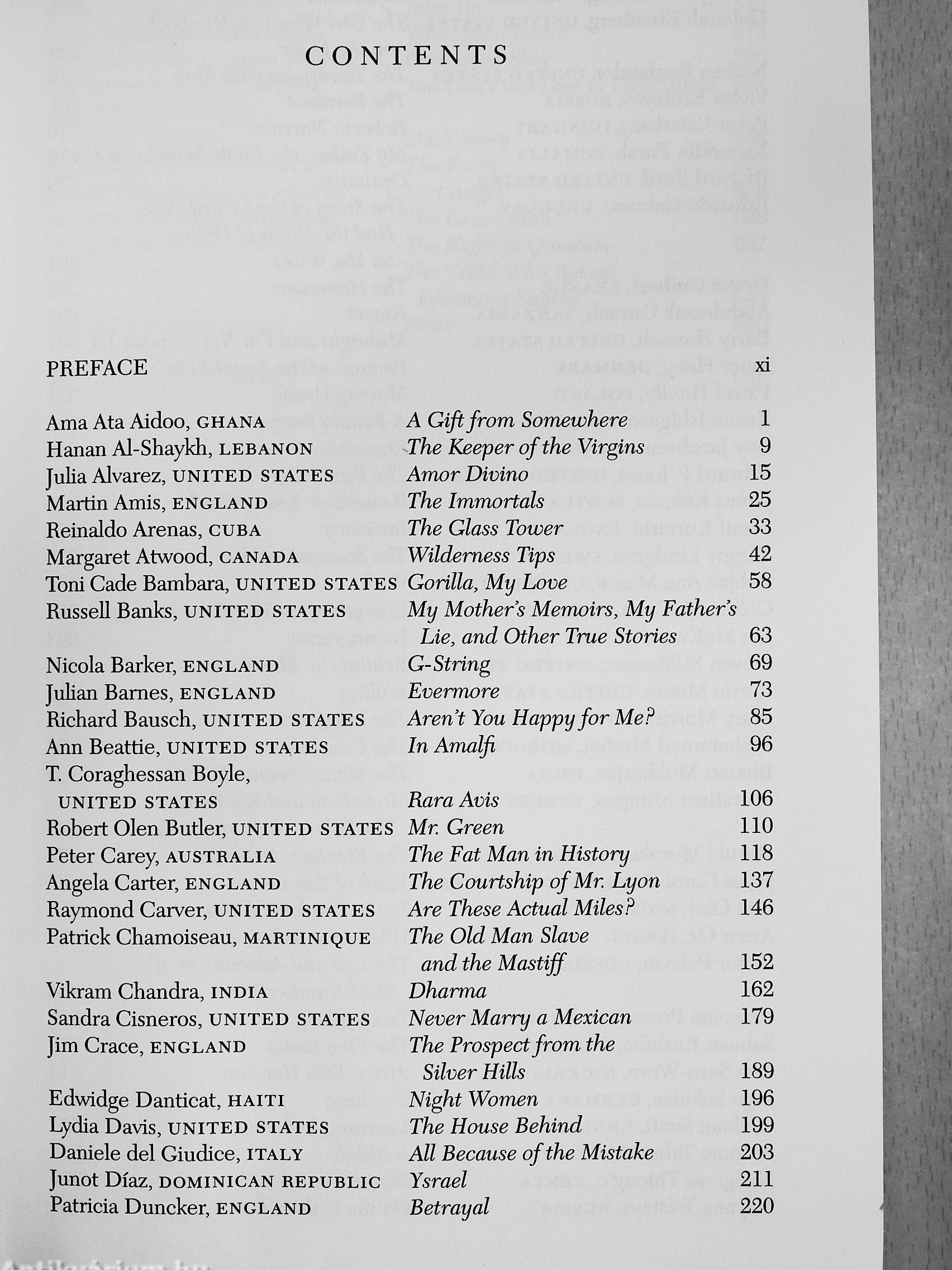 Readers will delight in the breadth of styles they find in these pages: from the powerfizl earthiness of Julia Alvarez's "Amor Divino" to the dazzling lyricism of Colum McCann's "Everything in This Country Must." They will find stories for every state of mind, from Hanif Kureishi's sensual examination of the complexities of love, "Intimacy," to Ken Saro-Wiwa's searing epistle that chillingly foreshadows his own execution, "Africa Kills Her Sun."