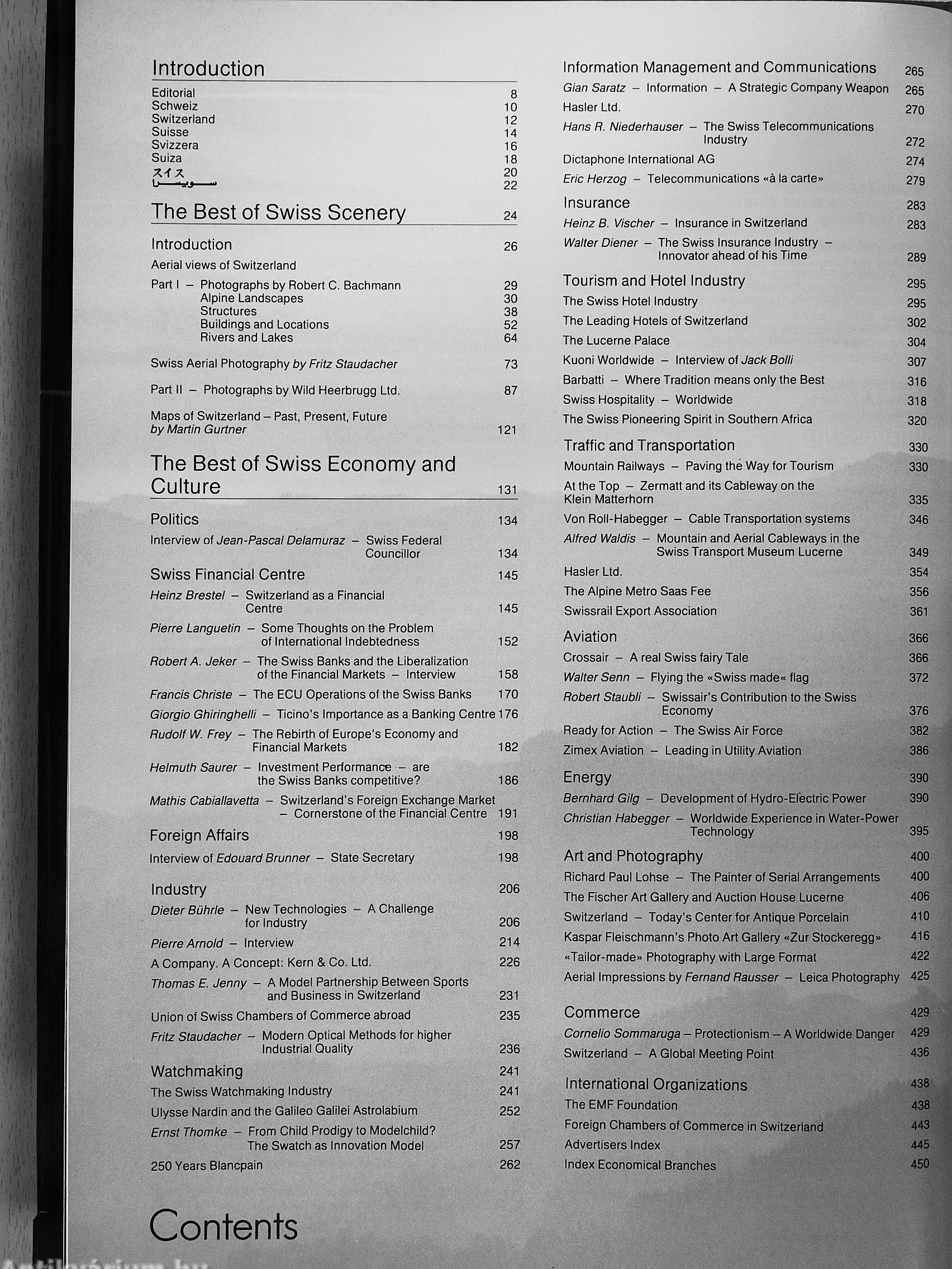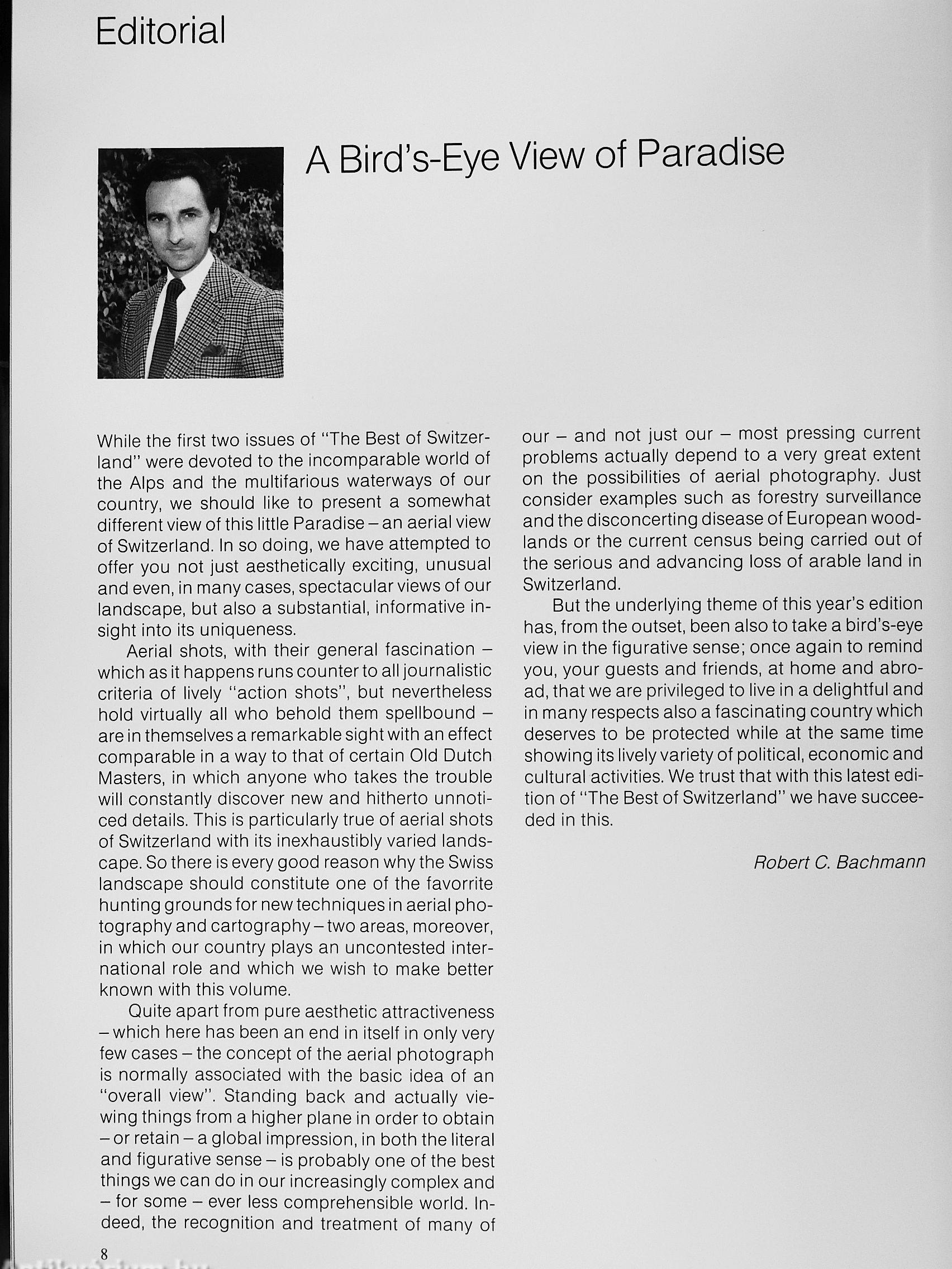The gripping photos, full of surprising and fascinating views captured by the renowned photographer, Robert C. Bachmann, who is also responsible for the pu-blicaton of this volume, and the blow-ups from Wild Heerbrugg Ltd. are, on this occasion devoted to aerial views of Switzerland. This provides an unusual and instructive image of Switzeriand, not only in its magnificent beauty but also in many other respects, too, while at the same time providing food for thought.