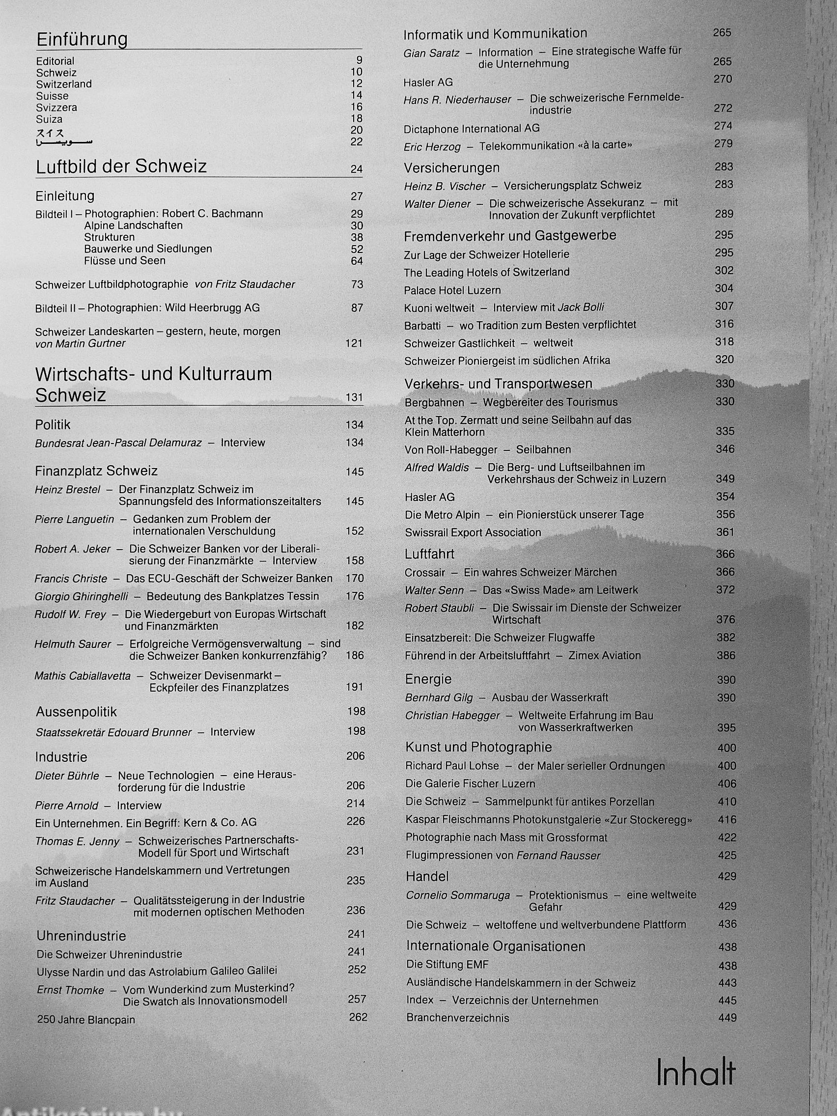 Der packende Bildteil mit den immer wieder überraschenden Aufnahmen des international renommierten Photographen Robert C. Bachmann, der auch als Herausgeber dieses Werkes verantwortlich zeichnet, sowie den Grossformataufnahmen aus dem Hause Wild Heerbrugg AG ist diesmal dem Luftbild der Schweiz gewidmet. Er vermittelt dabei nicht nur ein in seiner erhabenen Schönheit hinreissen-des, sondern ein in vieler Hinsicht ungewohntes, instruktives und zuweilen sogar nachdenklich stimmendes Bild unseres