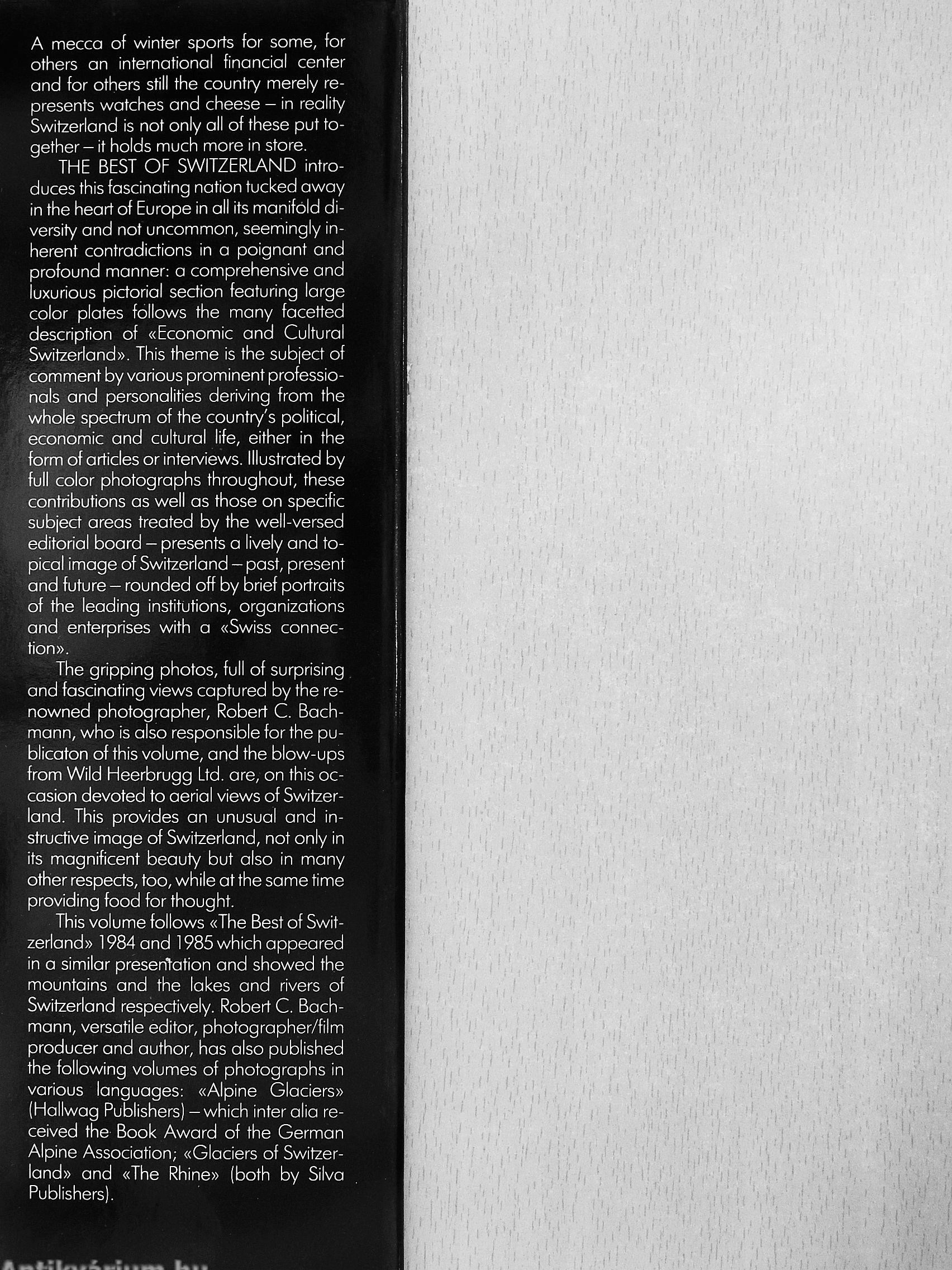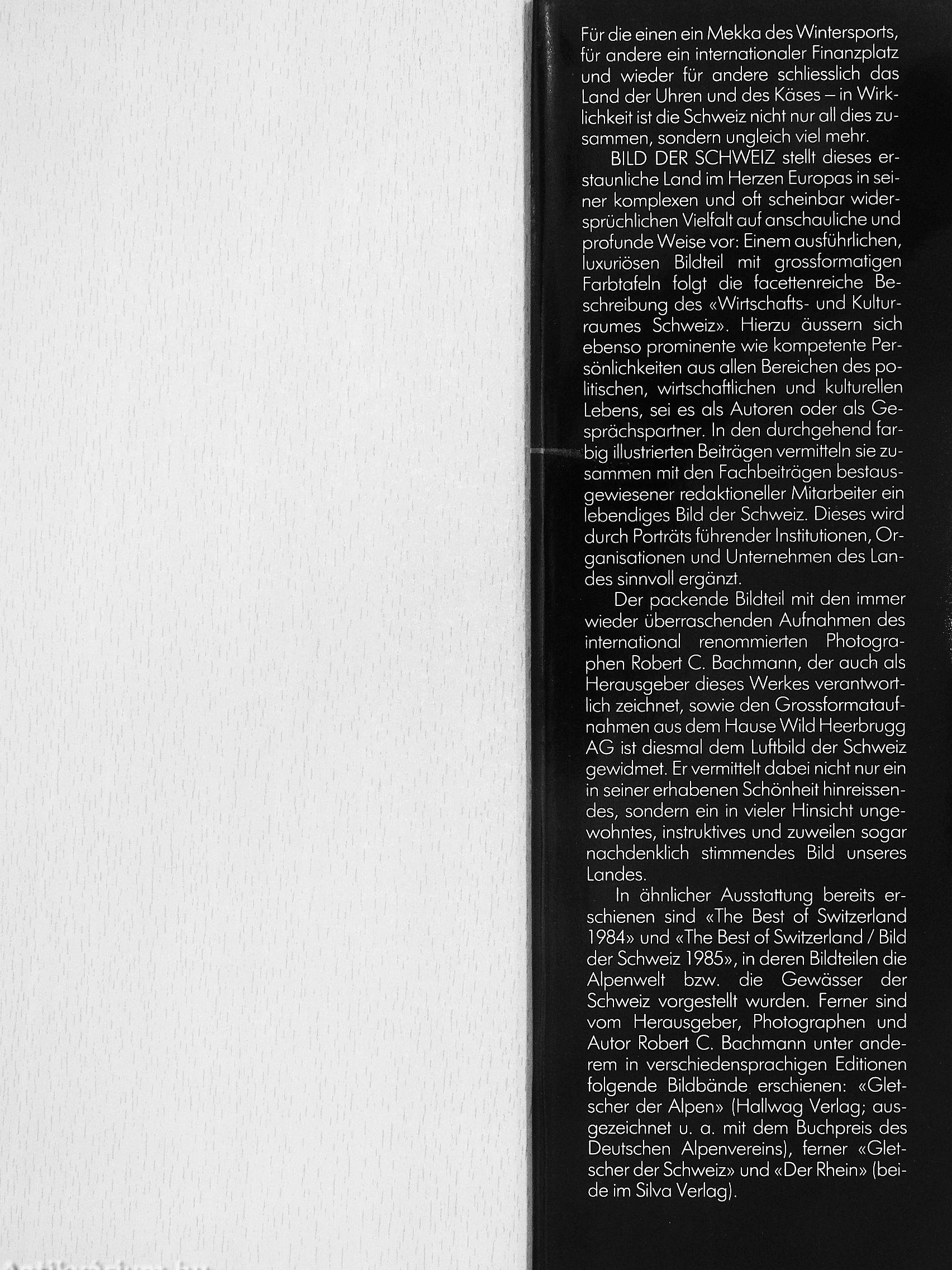 This volume follows «The Best of Switzerland» 1984 and 1985 which appeared in a similar presentation and showed the mountains and the lakes and rivers of Switzerland respectively. Robert C. Bachmann, versatile editor, photographer/film producer and author, has also published the following volumes of photographs in various languages: «Alpine Glaciers» (Hallwag Publishers) - which inter alia received the Book Award of the German Alpine Association; «Glaciers of Switzerland» and «The Rhine» (both by Silva Publishers).