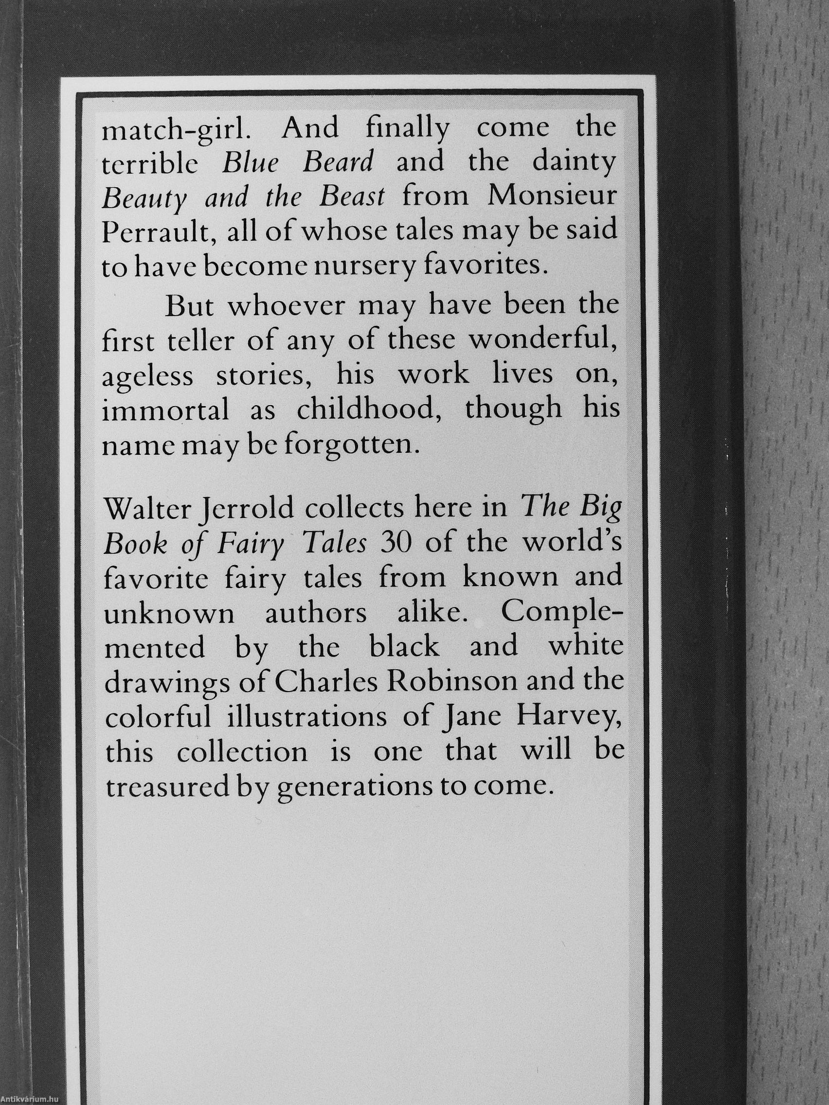 Walter Jerrold collects here in The Big Book of Fairy Tales 30 of the world's favorite fairy tales from known and unknown authors alike. Complemented by the black and white drawings of Charles Robinson and the colorful illustrations of Jane Harvey, this collection is one that will be treasured by generations to come.